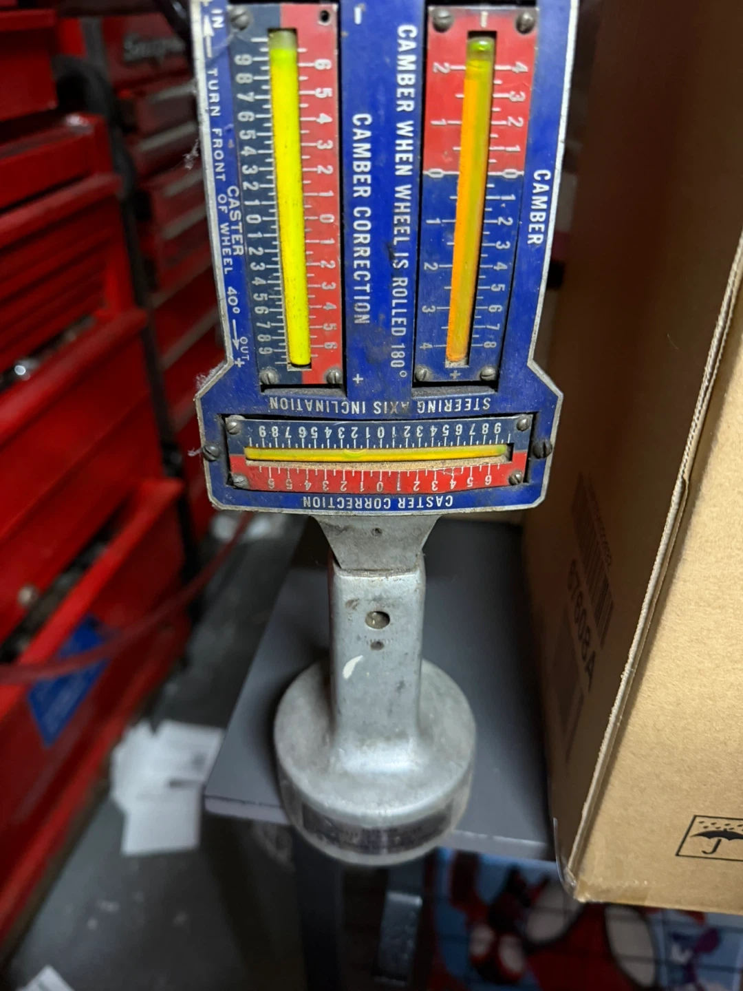This is a tool for measuring camber and caster angles on vehicles. It has a gauge for camber correction and steering axis inclination. The tool is made of metal with clear measurement indicators.