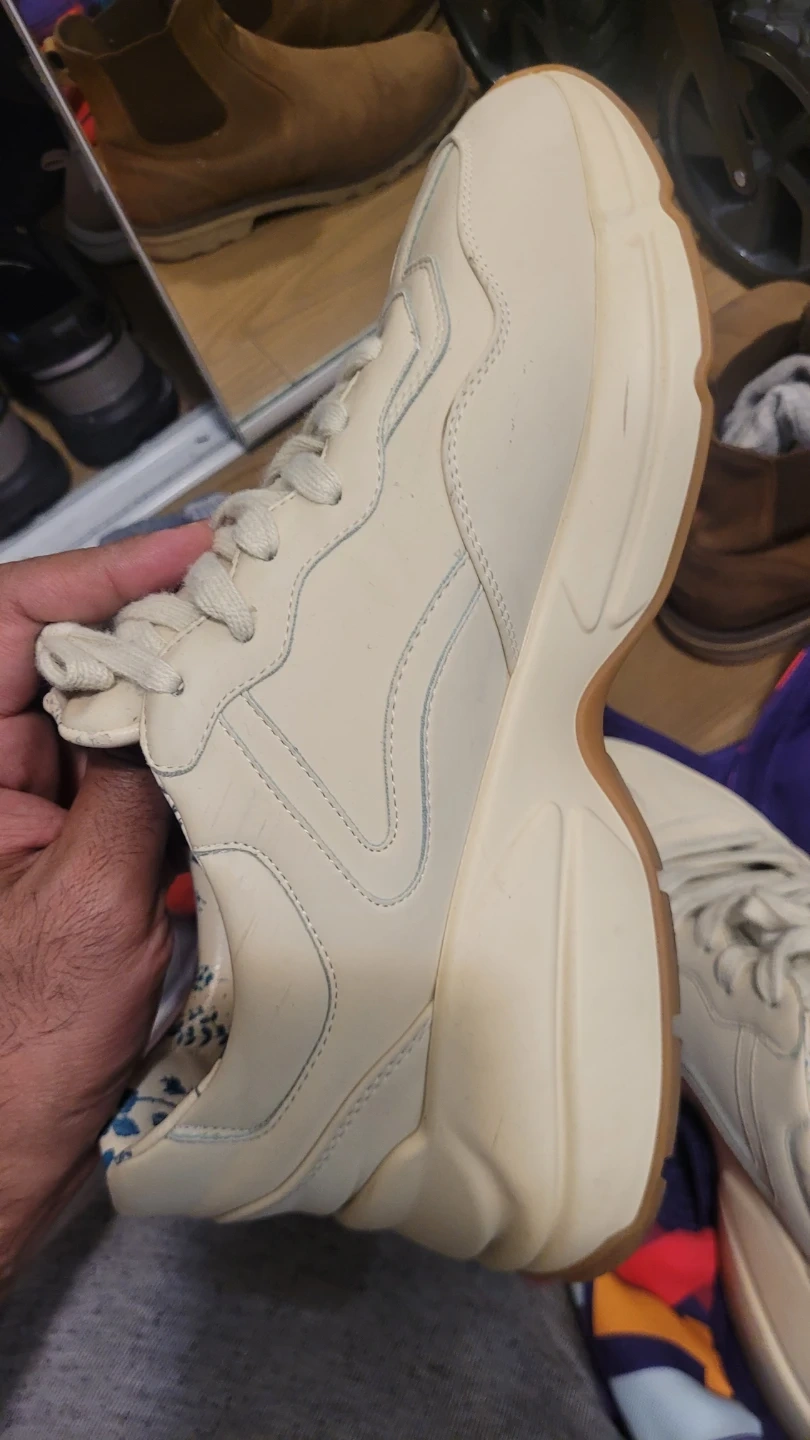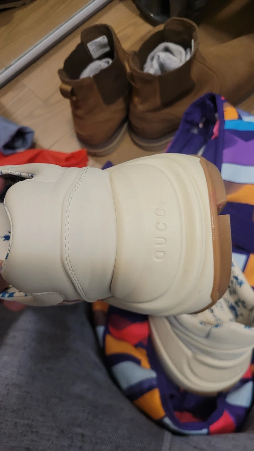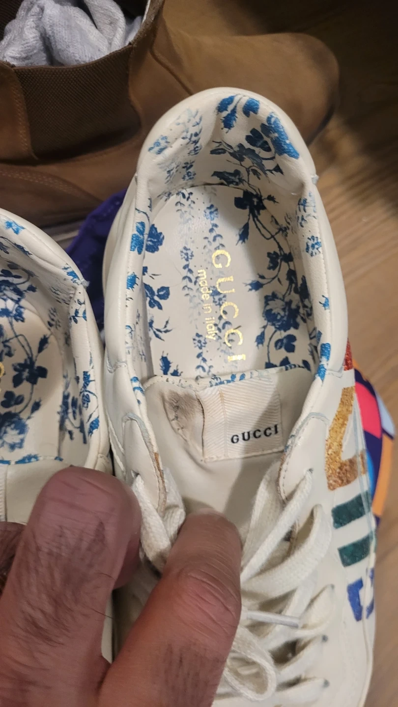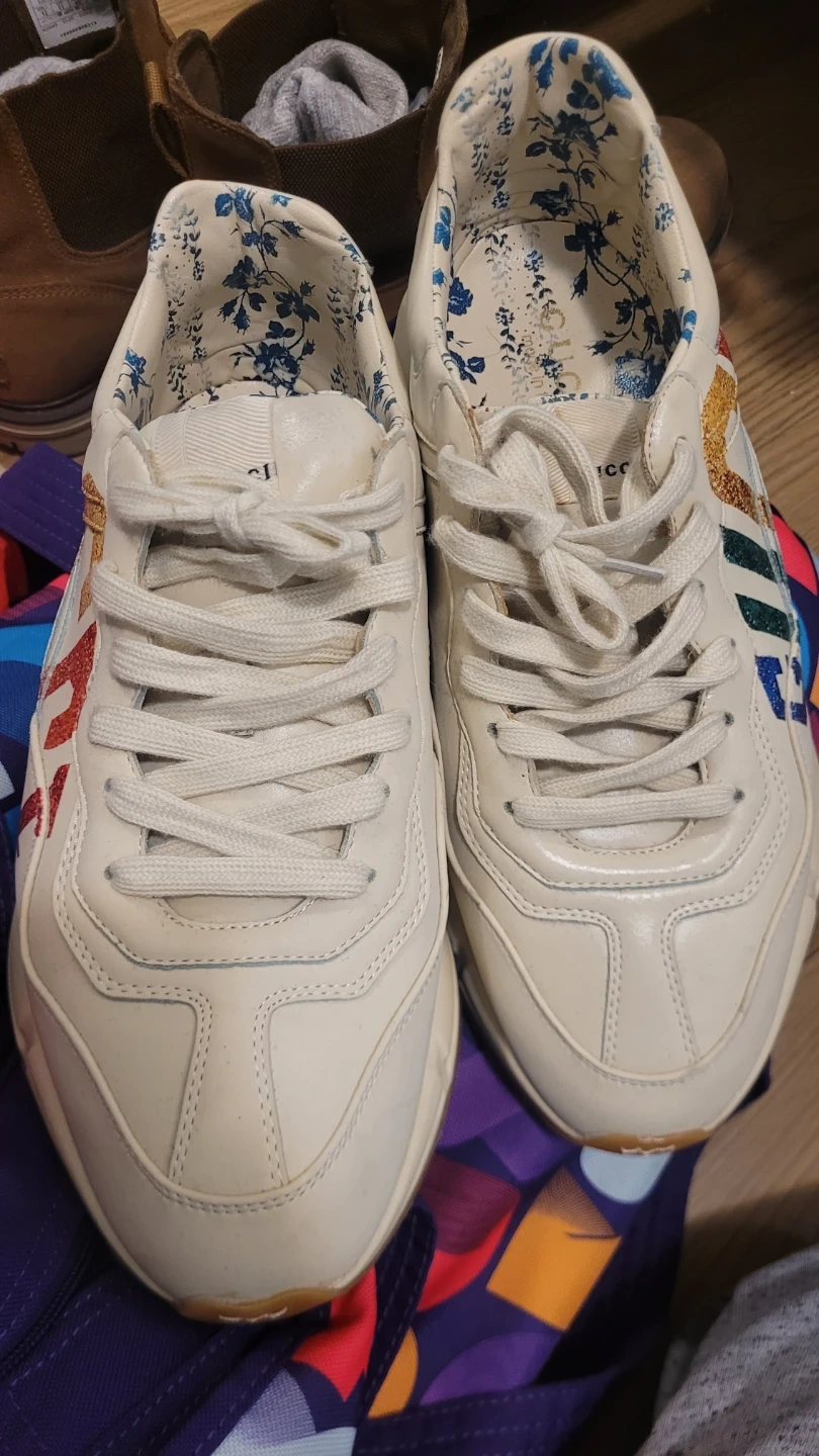Selling a pair of Gucci sneakers. They have a colourful design on the side and a floral pattern inside. They are in good condition!