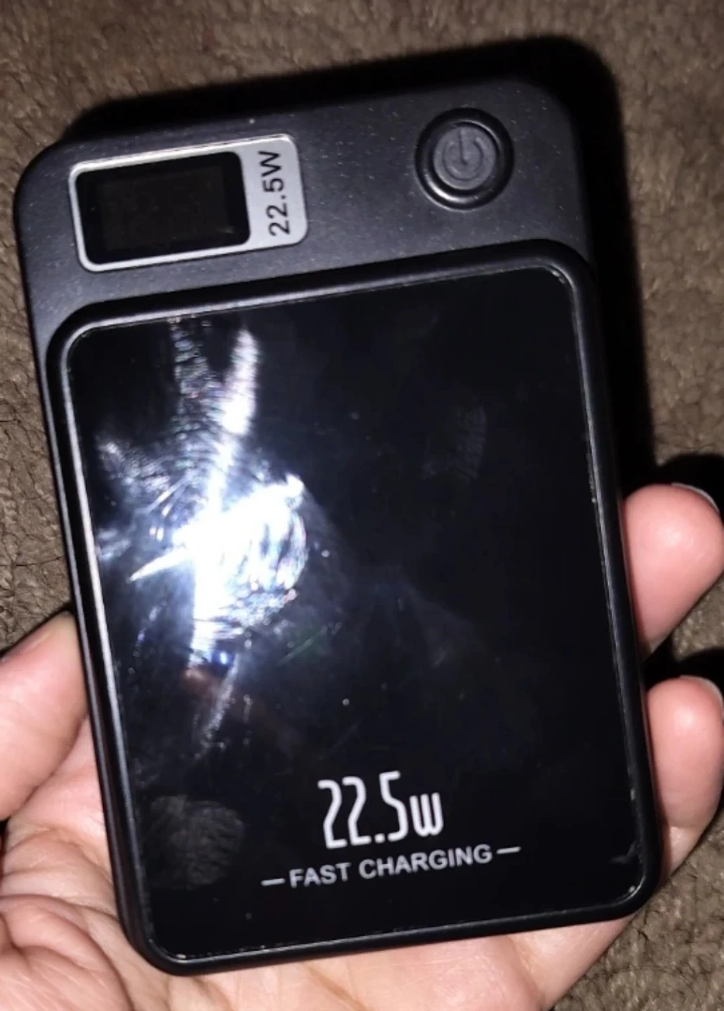 This is a 22.5W fast charging power bank. It has a digital display to show power levels. The unit features a power button for on/off functionality. It's black and has a glossy finish.