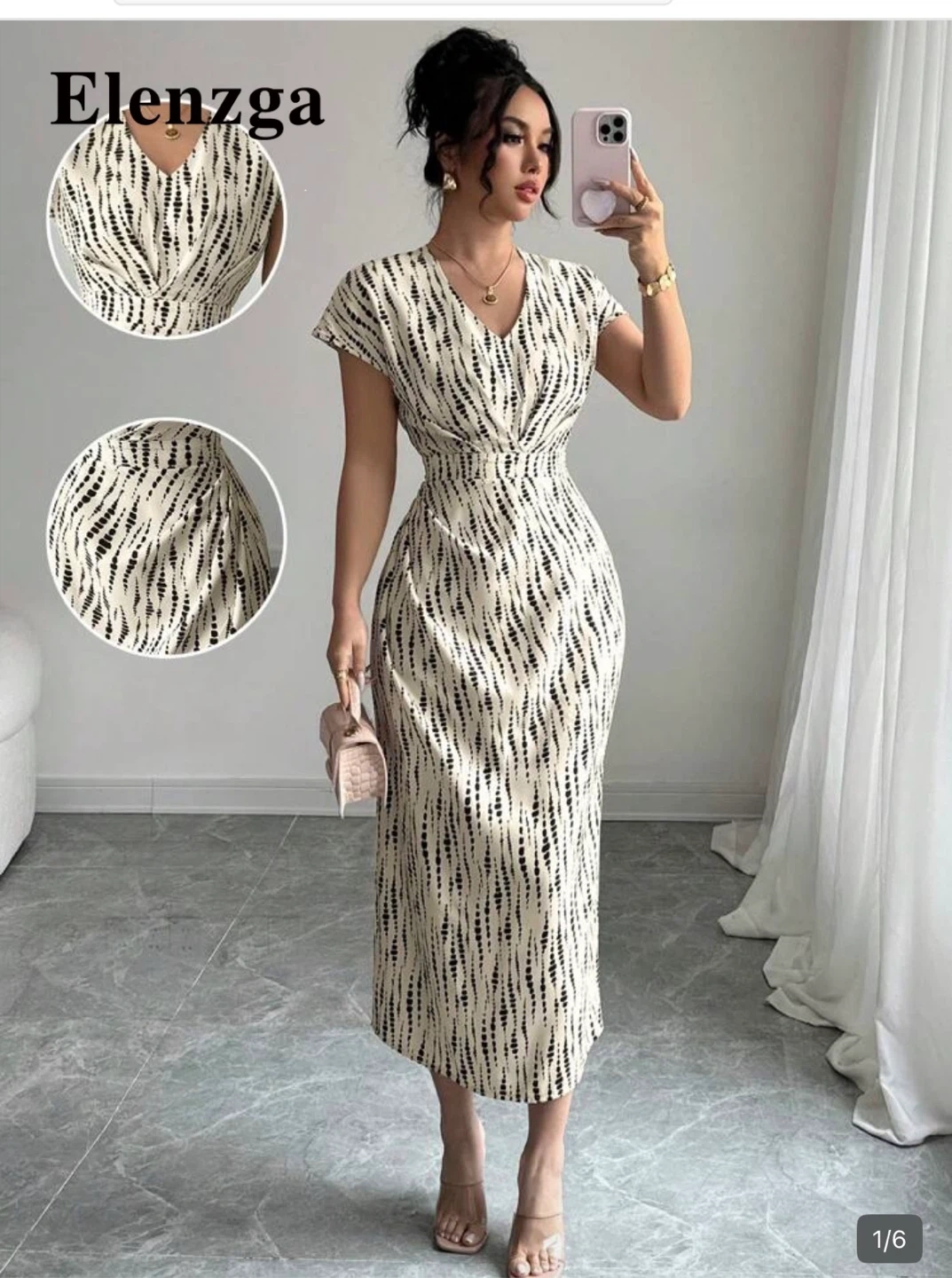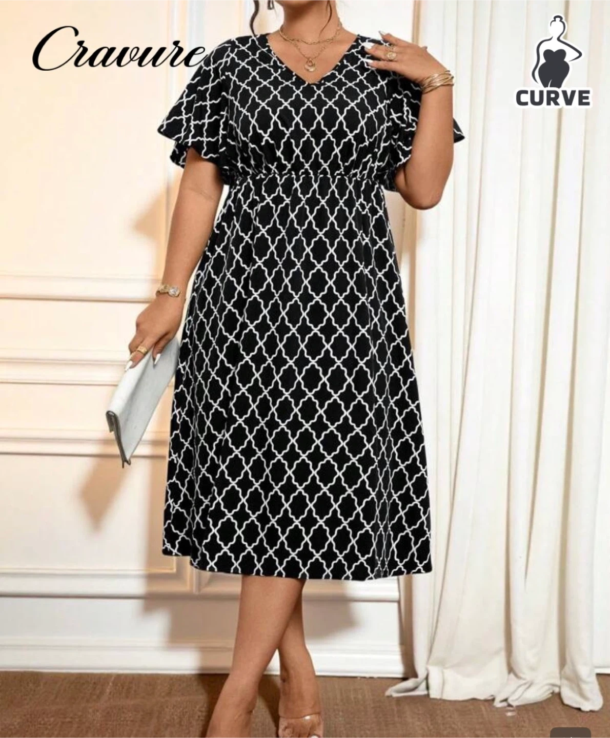 Cravure Curve offers this stylish black and white patterned dress. It features a flattering V-neck and flutter sleeves with a cinched waist. Great for a casual outing or a dressed-up occasion!