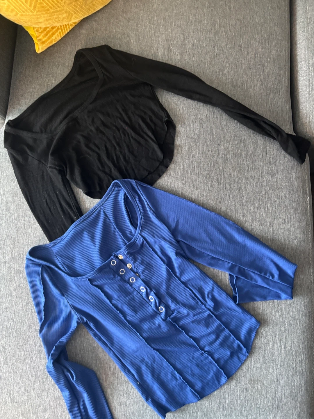 Two long sleeve tops, one in royal blue and one in black. Both are ribbed knit fabric and feature a scoop neckline. The blue top has a button-up front with silver-toned hardware. Great for layering!
