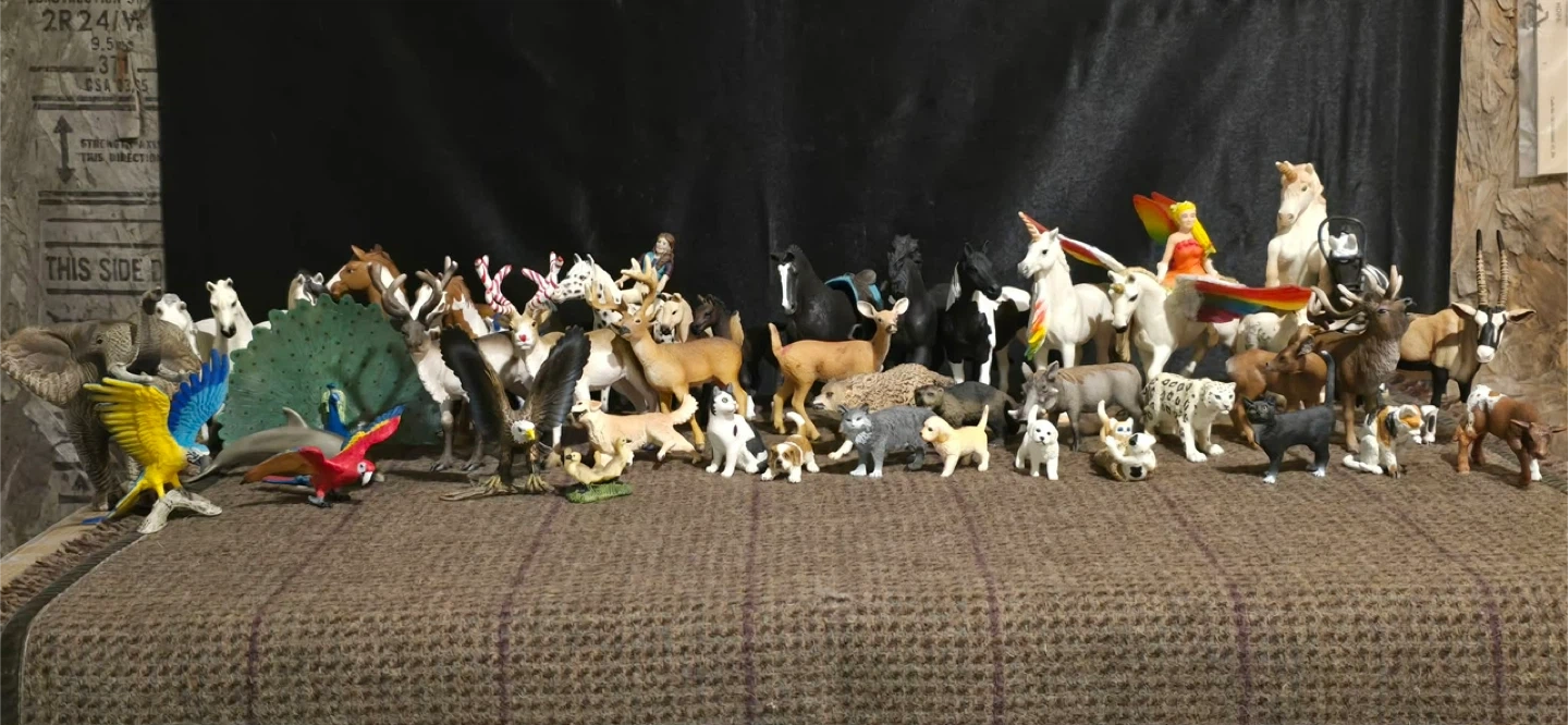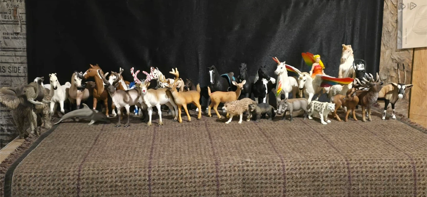 A diverse collection of 48 animal figurines, including horses, unicorns, dogs, horses, parrots, and various wild animals. These are pre-owned toys in perfect condition. They're suitable for imaginative play or display. some are vintage