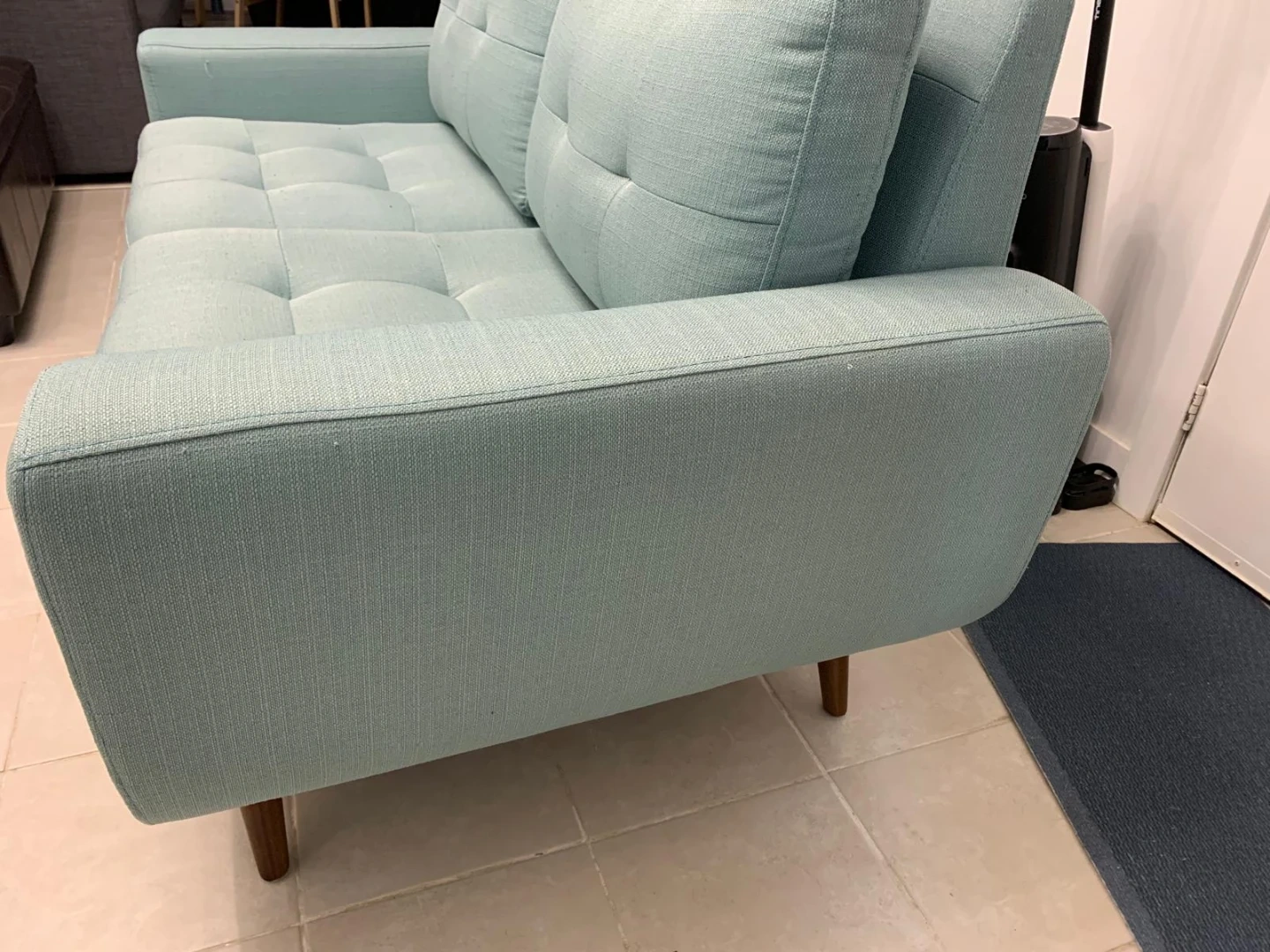 This light blue loveseat features a modern tufted design. It's upholstered in a durable fabric. The sofa has wooden legs. Perfect for small spaces!