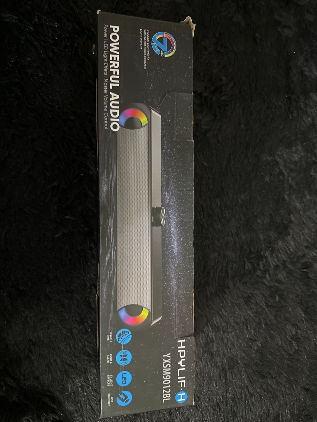 This Hpyilif-A soundbar features powerful audio and 7-colour LED lighting with a light display. It's great for enhancing your computer or gaming setup with both sound and visuals. Volume control is conveniently located on the top.