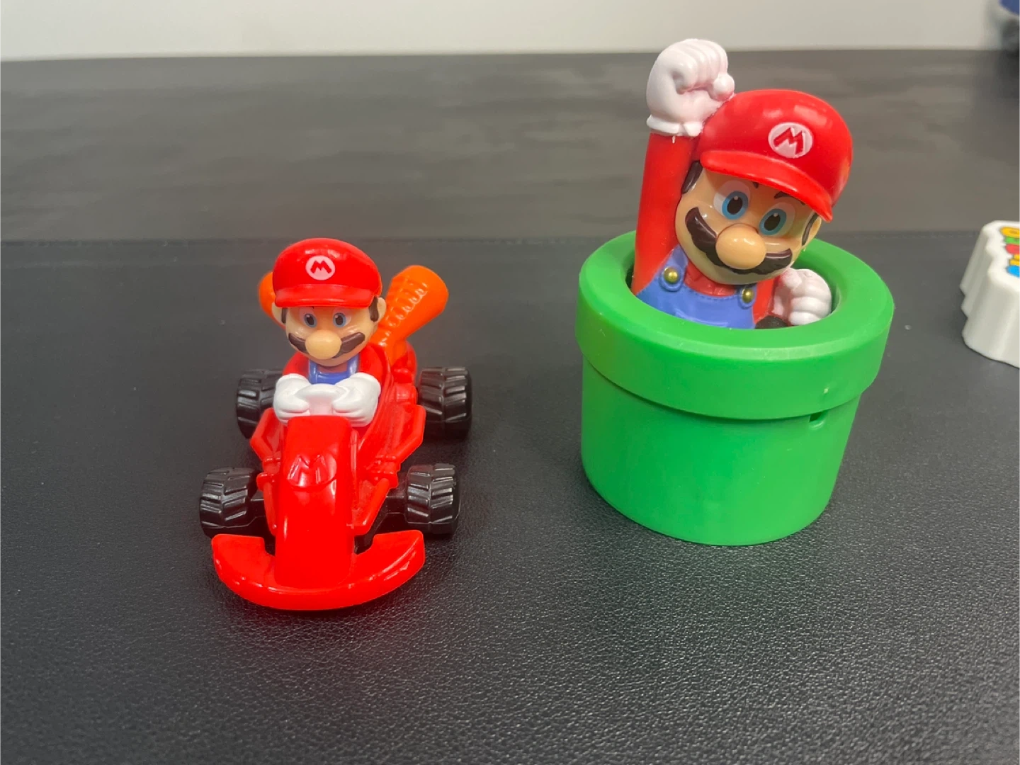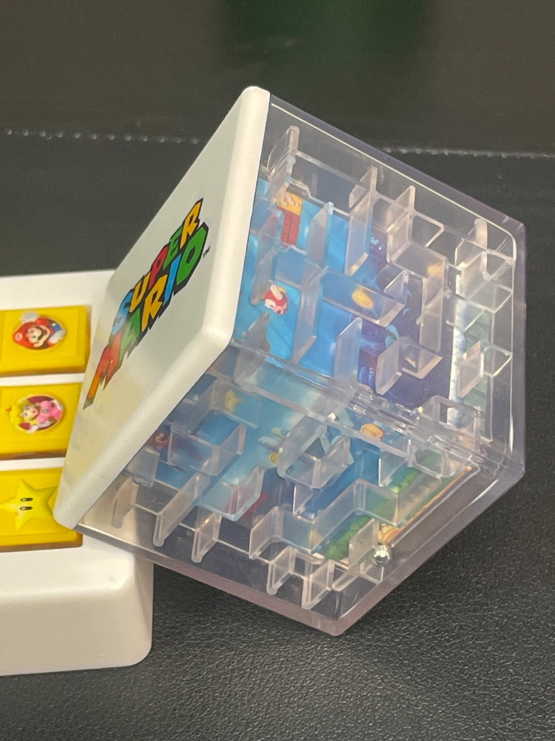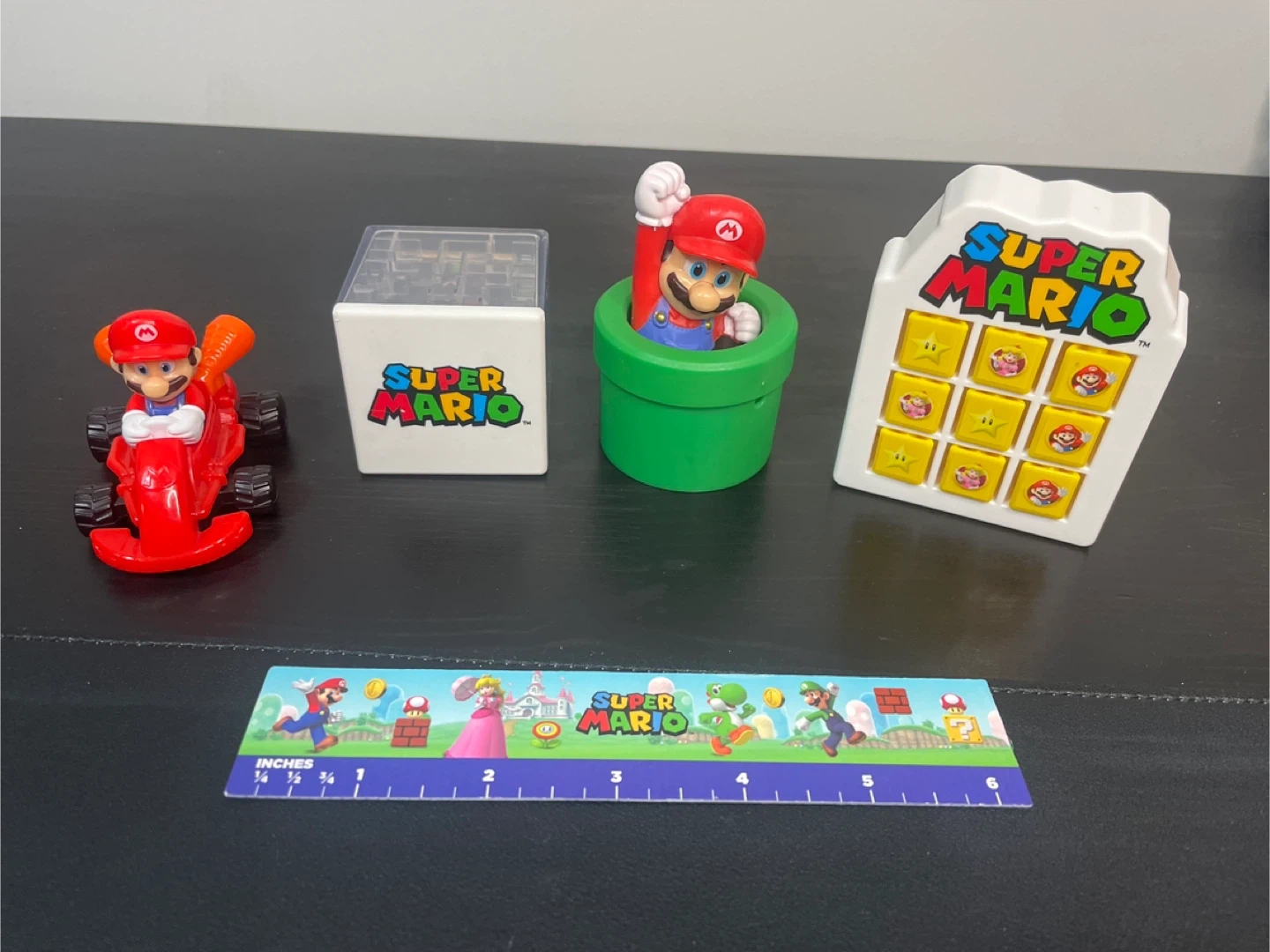 This Super Mario lot includes a clear cube maze with Mario characters inside. It also has a Mario character popping out of a green pipe, a handheld maze game with buttons, and a Super Mario ruler. Great for any Nintendo fan!