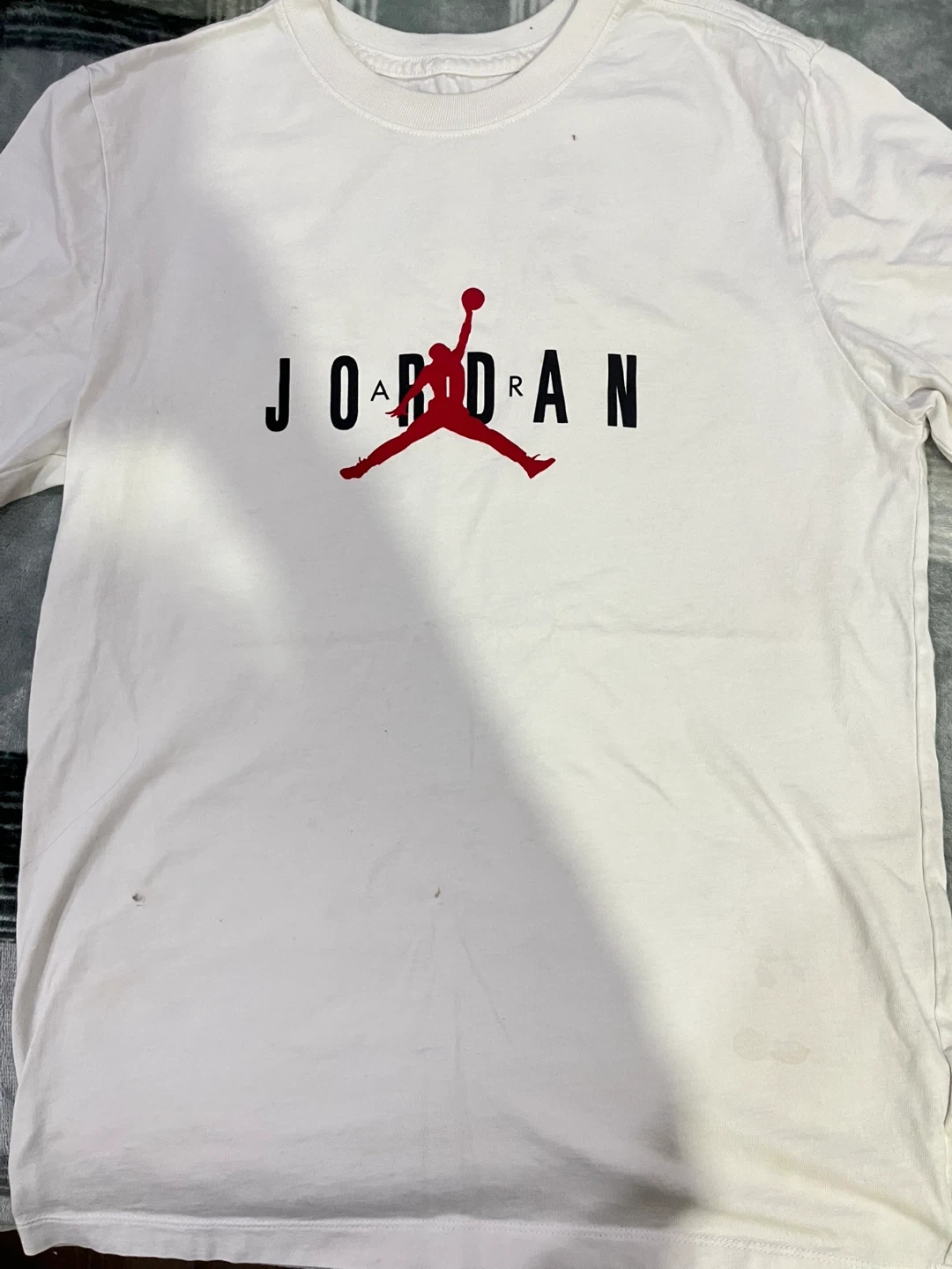 Selling a Jordan white t-shirt. It has the Jordan logo on the front. It's in good condition and ready for a new home.
