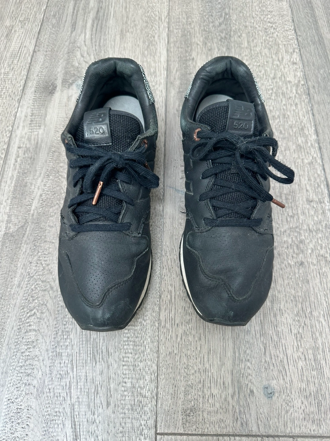 Selling a pair of New Balance 520 sneakers in black. Some wear and tear but still have life in them. They have a stylish look and are great for everyday wear.