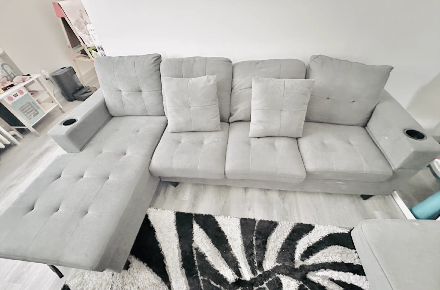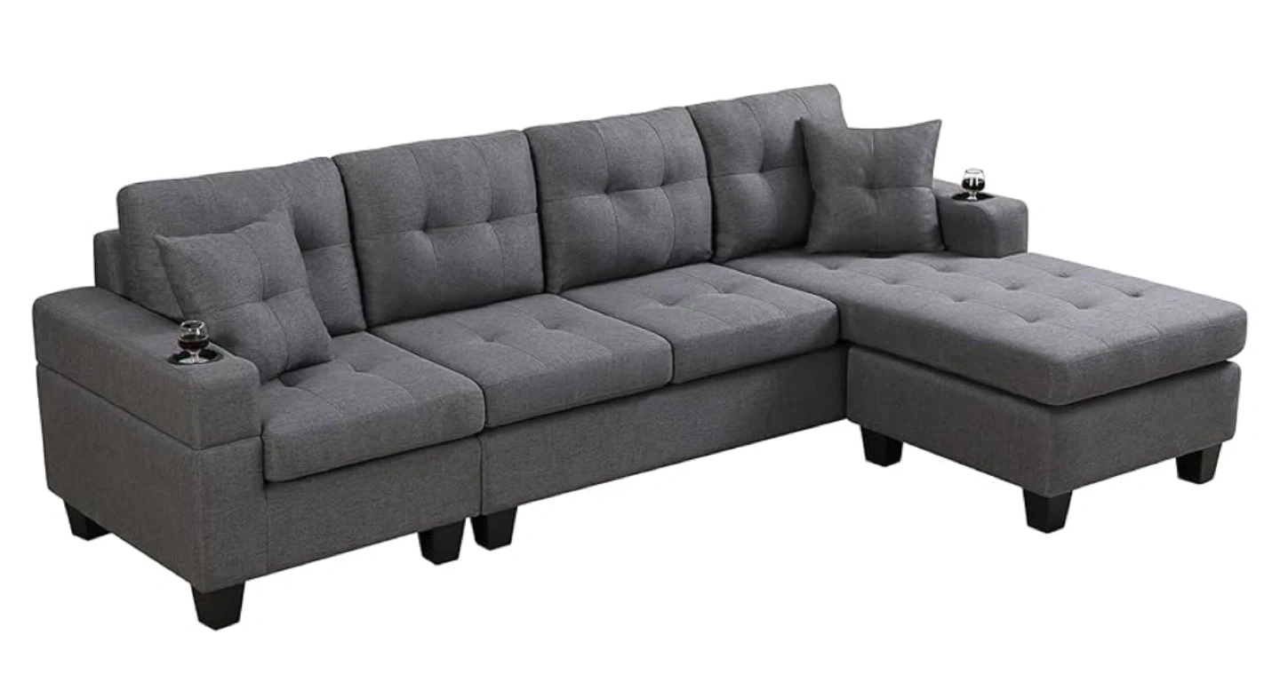This sectional sofa comes in a stylish grey fabric. It features a chaise with built-in storage, perfect for stashing away blankets or pillows. Two cup holders are integrated into the armrests for convenience. It's great for movie nights or relaxing with family!