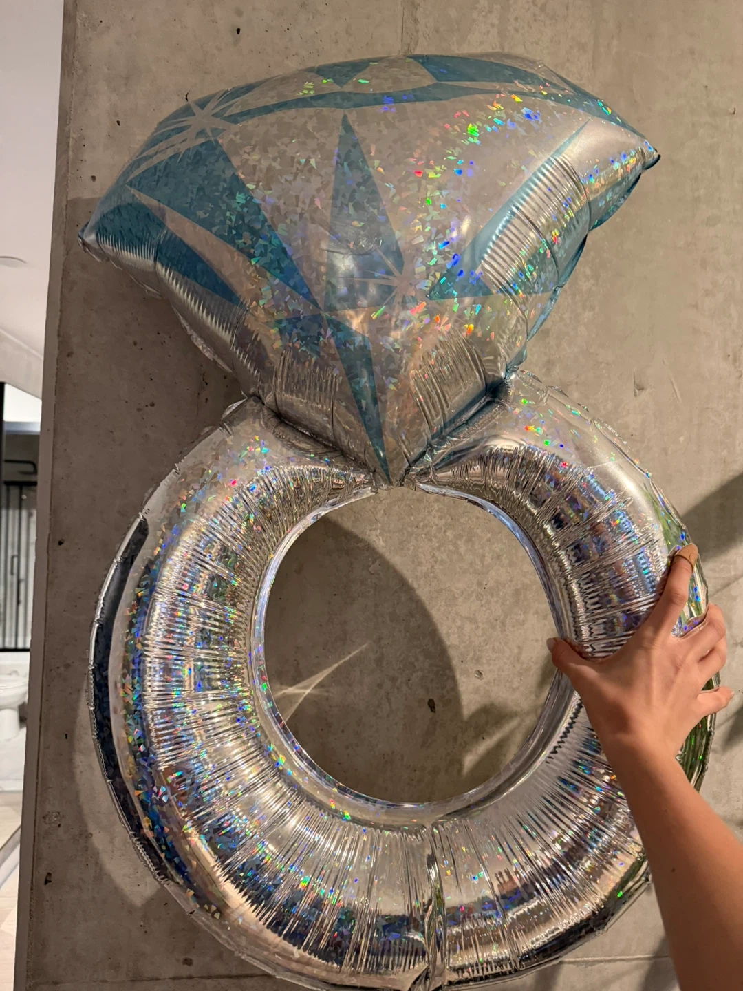 Set of two diamond ring shaped mylar balloons. These are silver and blue with a holographic sparkle finish. Great for engagement parties or bridal showers! Free!