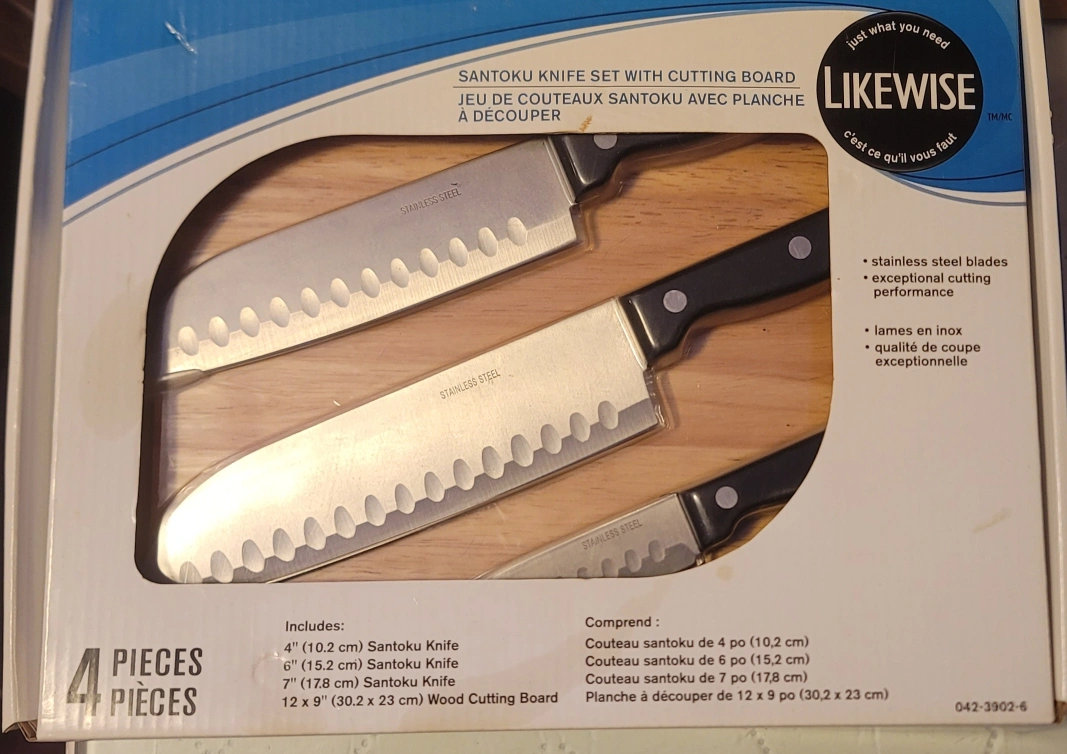 New LikeWise Santoku knife set. Includes three knives and a wooden cutting board. Knives are 4", 6", and 7". Stainless steel blades.