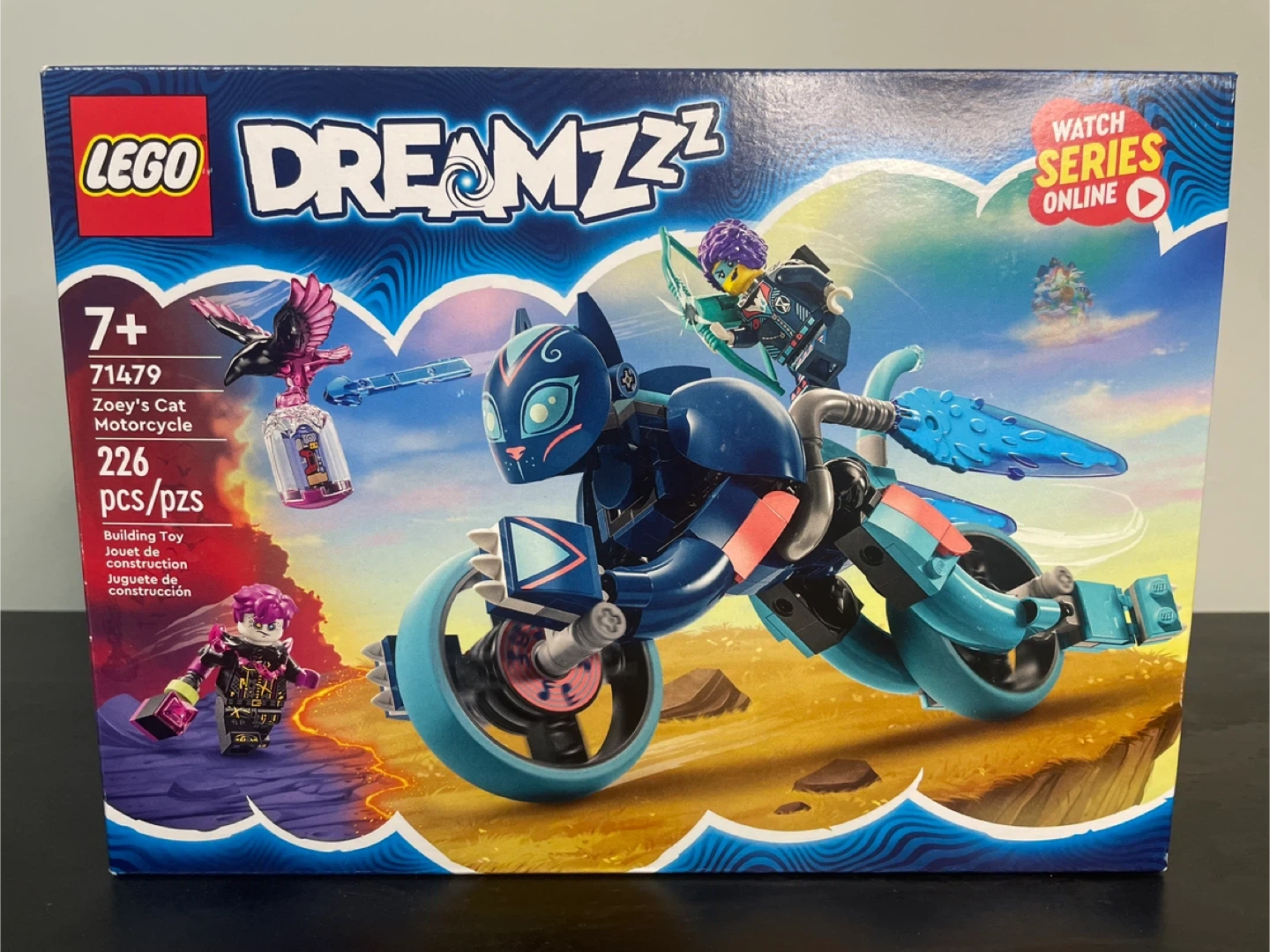 This is the LEGO DreamZzz Zoey's Cat Motorcycle building set. It includes 226 pieces and is recommended for ages 7+. Kids can build Zoey's awesome cat motorcycle and take part in exciting adventures.
