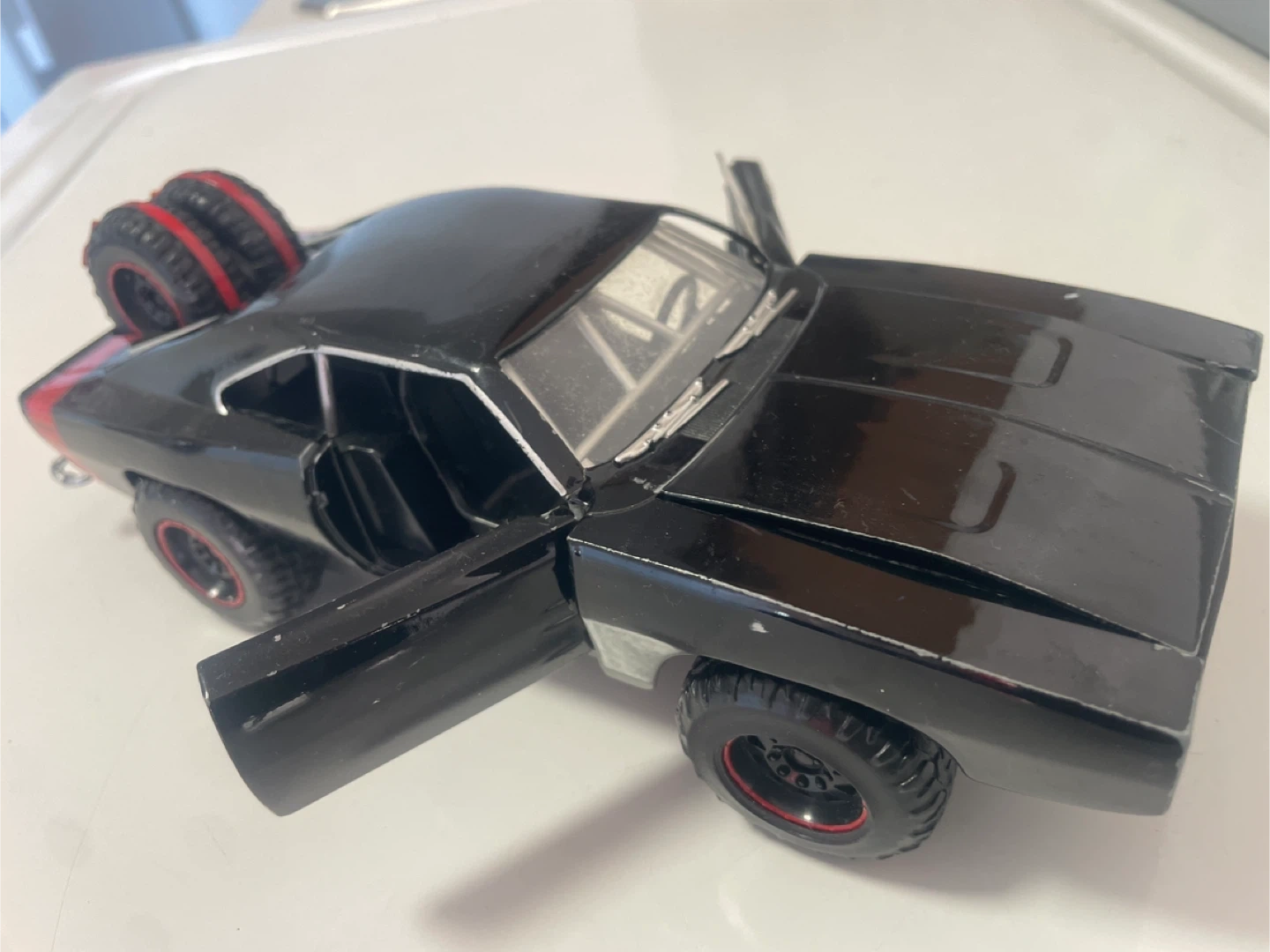This is a black die-cast toy Dodge Charger with red trim on the wheels and spare tires. The doors and hood open for detail. It's a cool model car!