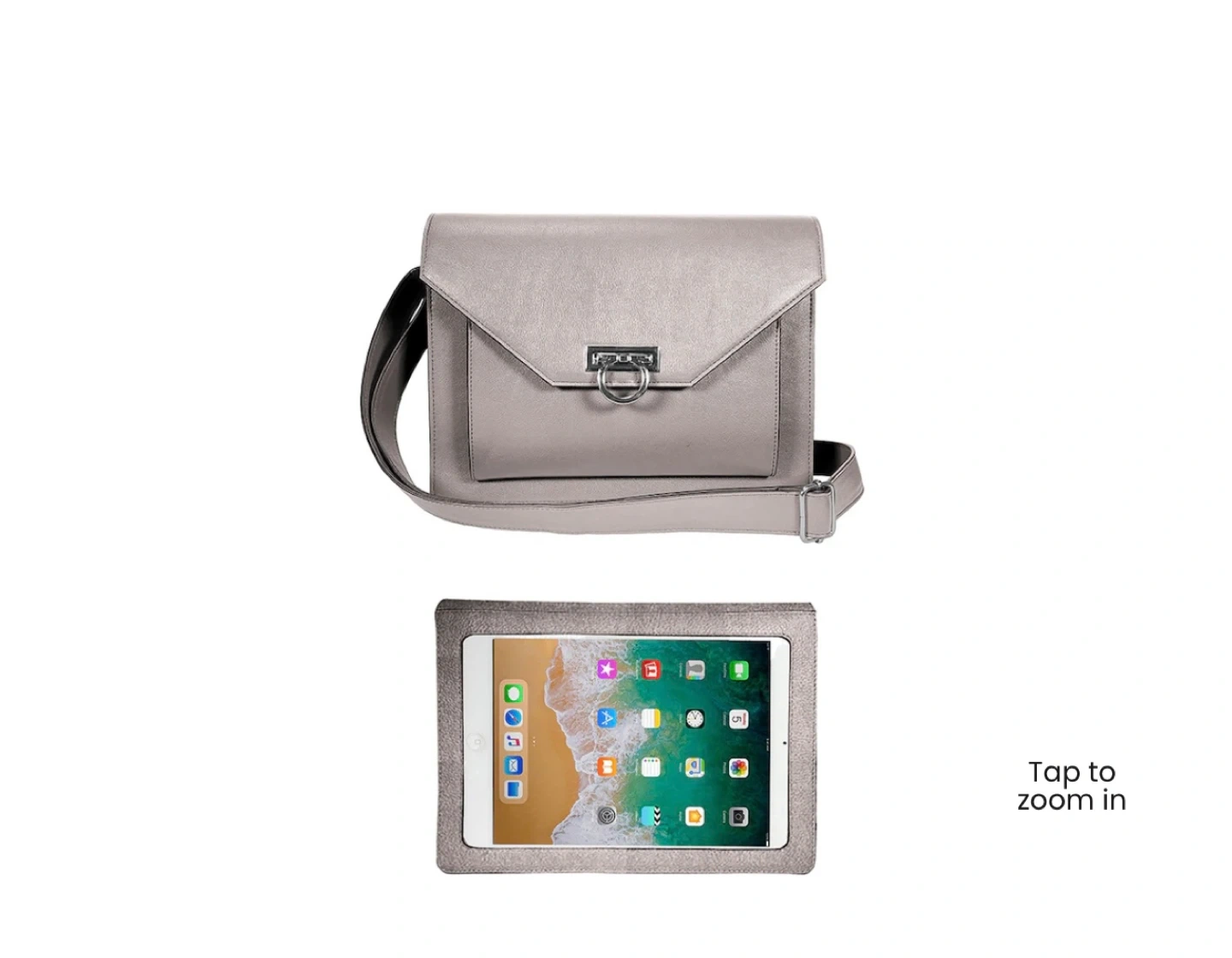 This is a stylish silver clutch bag designed to hold a tablet. It features a secure clasp closure and a convenient shoulder strap. The interior has several compartments for organization.