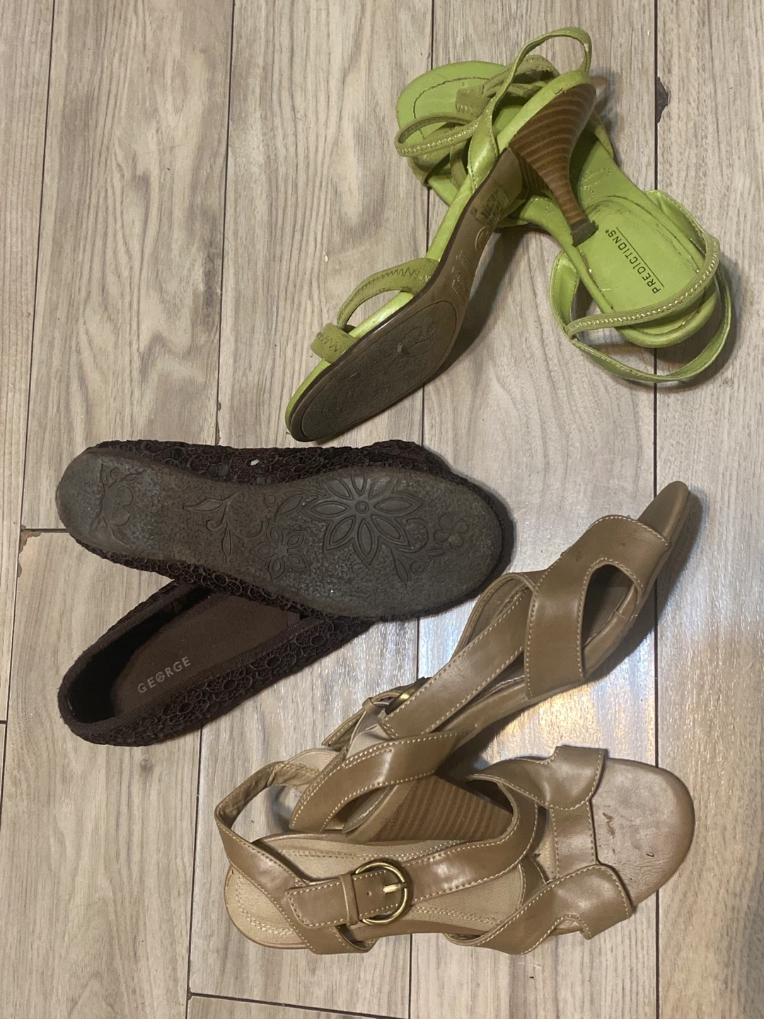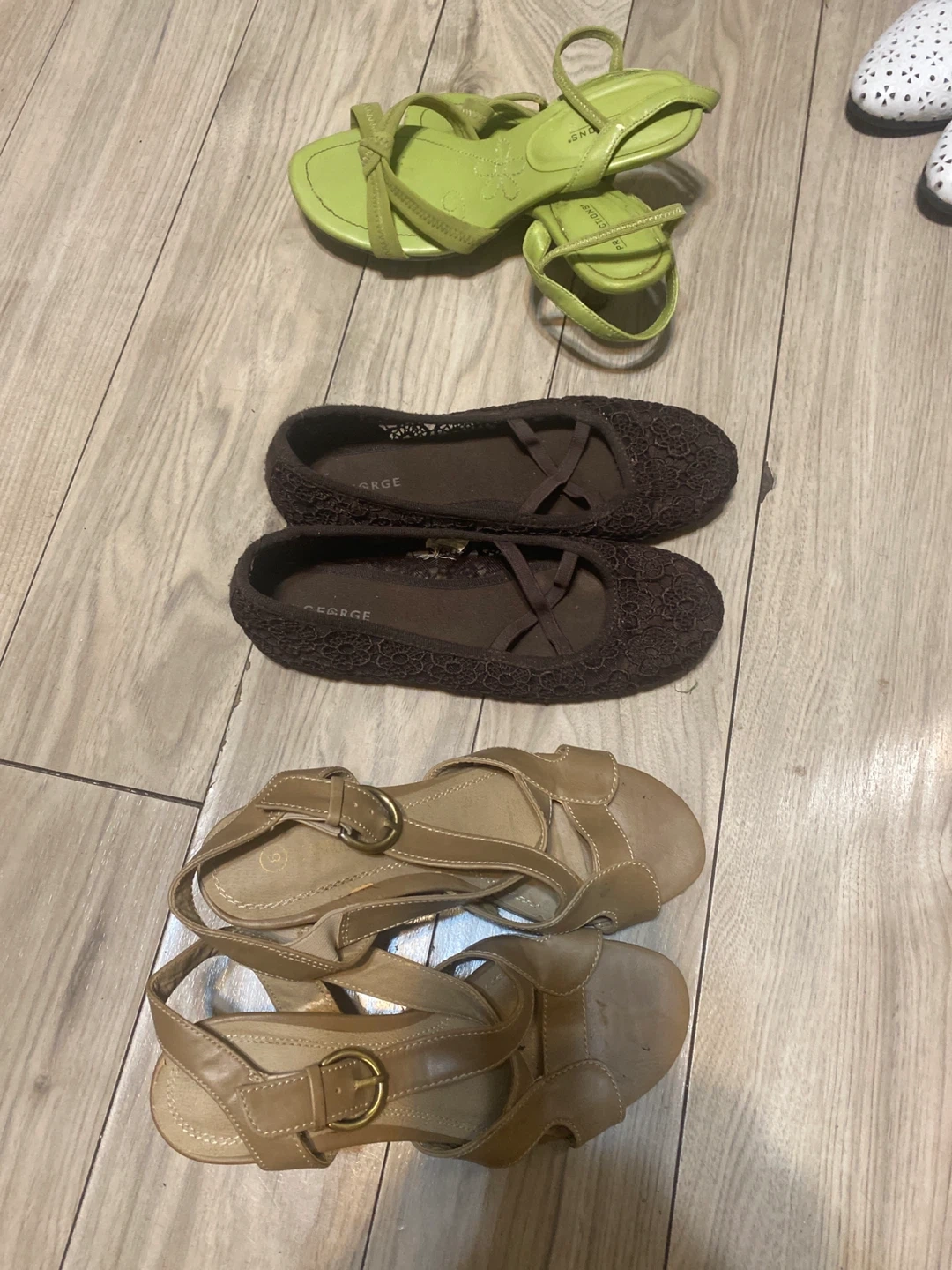 Selling 3 pairs of women's shoes. Includes a pair of George flats and two pairs of sandals. Great for everyday wear! Are you going south? Pack them up , enjoy and give away to poor.$20 for the three pairs.