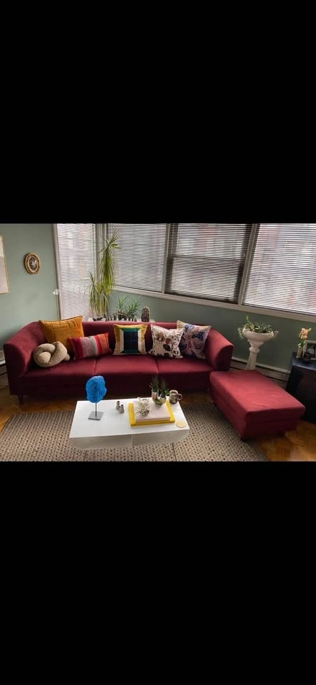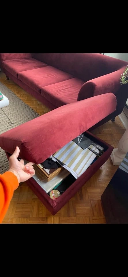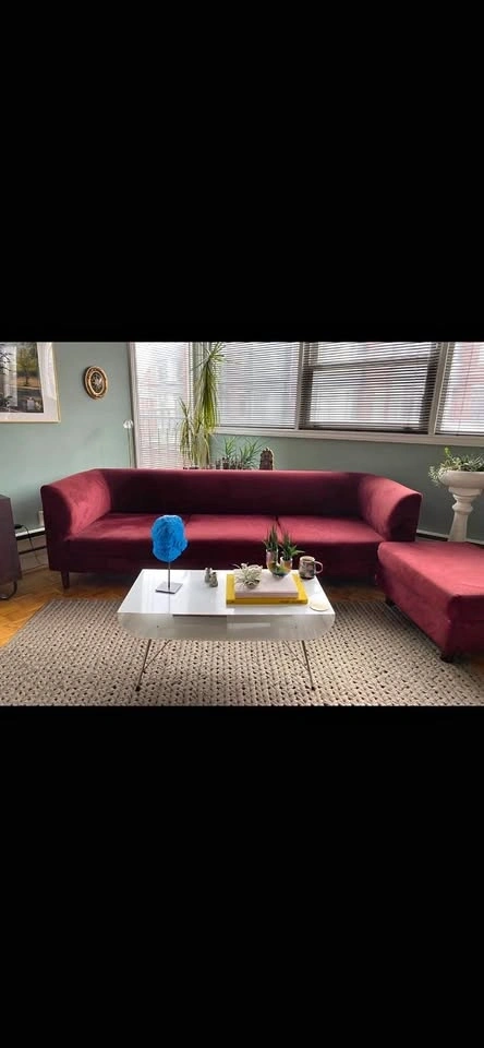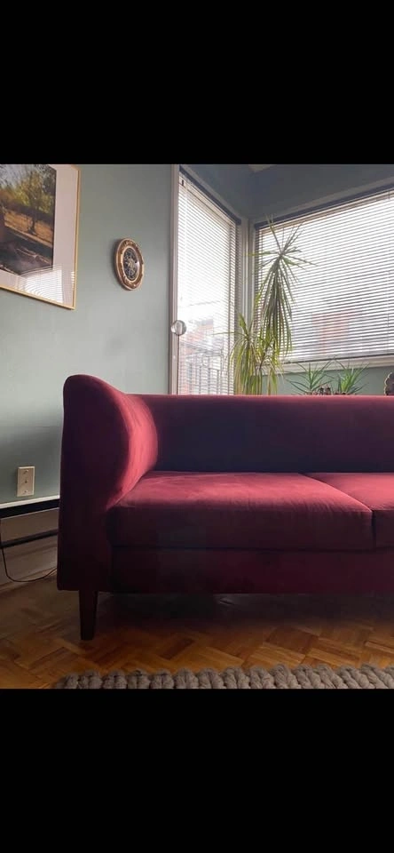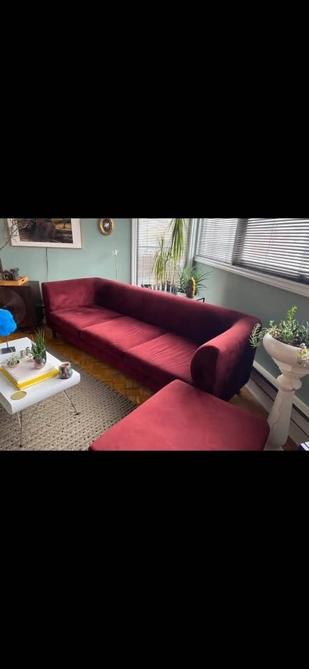 Moving Sale. I’m downsizing! I’ve been obsessed with this piece but it’s time to say goodbye. Burgundy velvet sofa and matching ottoman. Gently used. No tears in fabric. The ottoman has storage space. Slight hand-sized shade difference on left hand facing seat, only visible under certain angles and bright light. Sofa overall measurements: W98 x D32 x H30”. Sofa seat depth: 26”. Ottoman measurements: W31 x D26 x H17”. Price includes sofa and ottoman. Brand: EQ3 Style: Replay Retail new sofa: $2999. Ottoman: $899