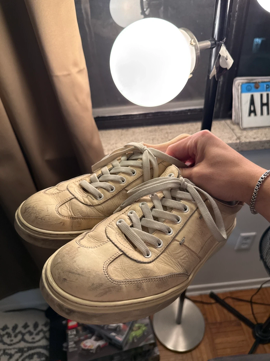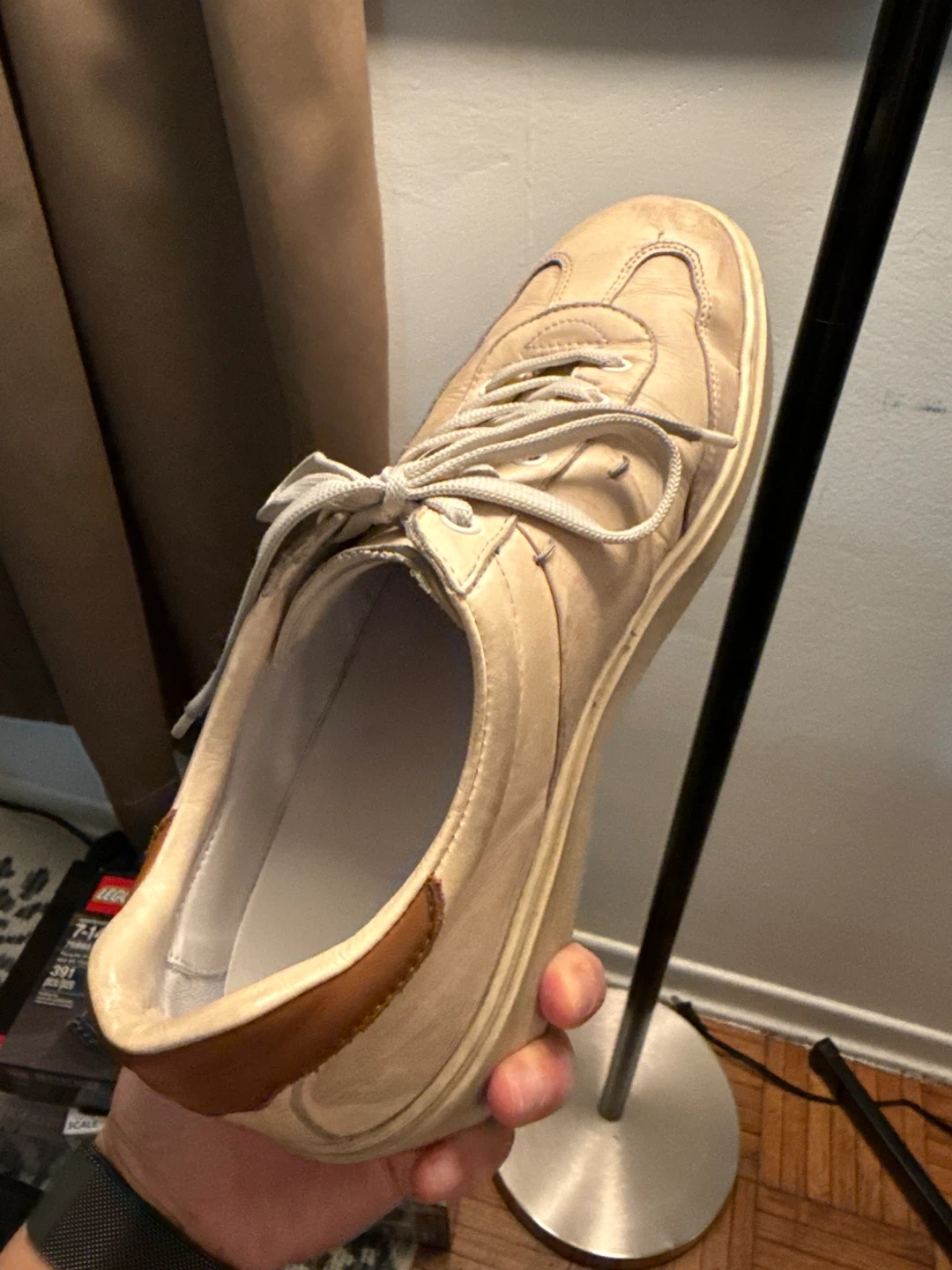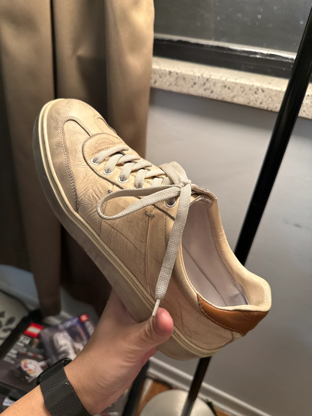 These stylish Luca Del Forte leather sneakers are made in Italy. They feature a light tan leather upper with brown leather accents on the heel. Size 43.