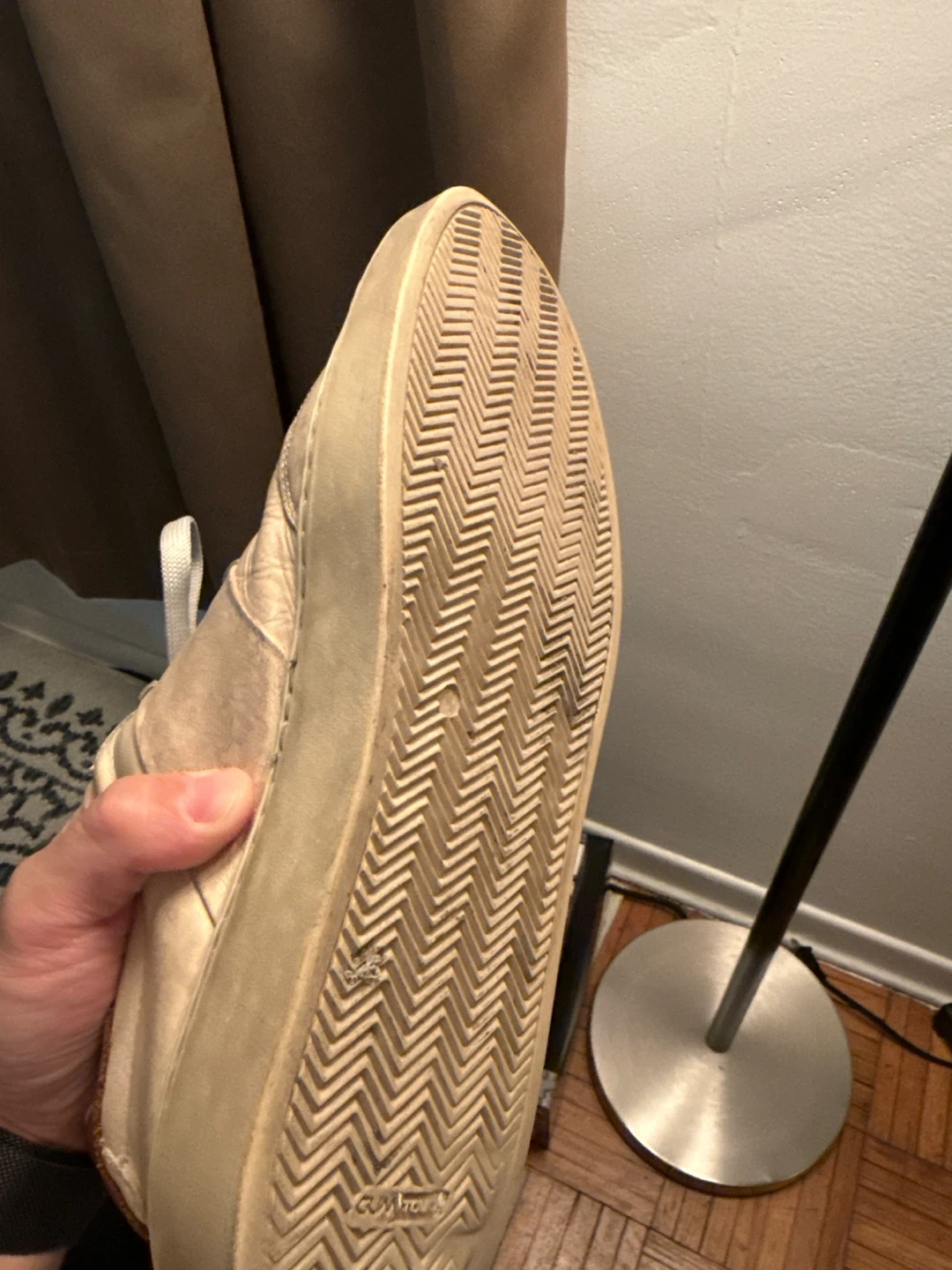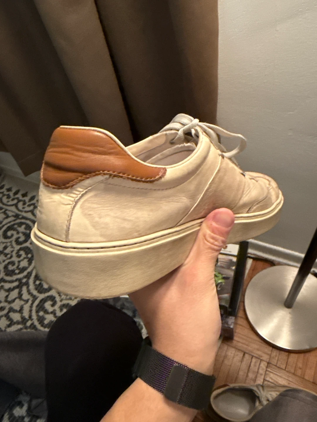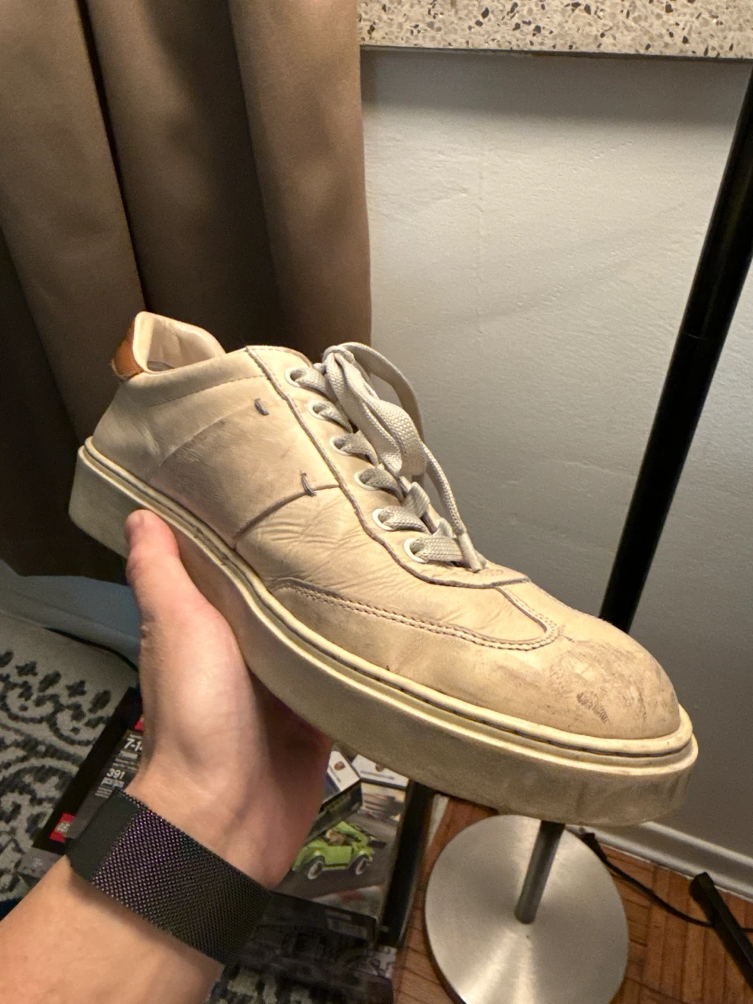 These stylish Luca Del Forte leather sneakers are made in Italy. They feature a light tan leather upper with brown leather accents on the heel. Size 43.