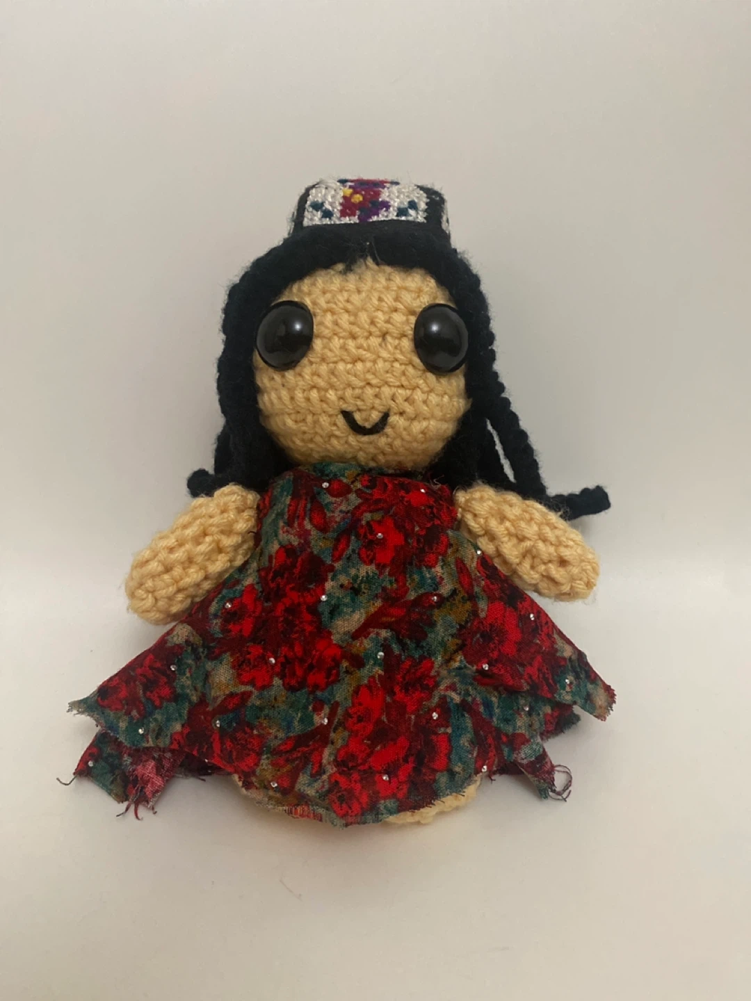 This is a handmade crochet doll with a unique design. It features a crocheted body, black yarn hair, and a colorful dress with a floral pattern. Wears a dopi (Uzbek hat). The doll is in good condition and ready to be loved by a new owner!