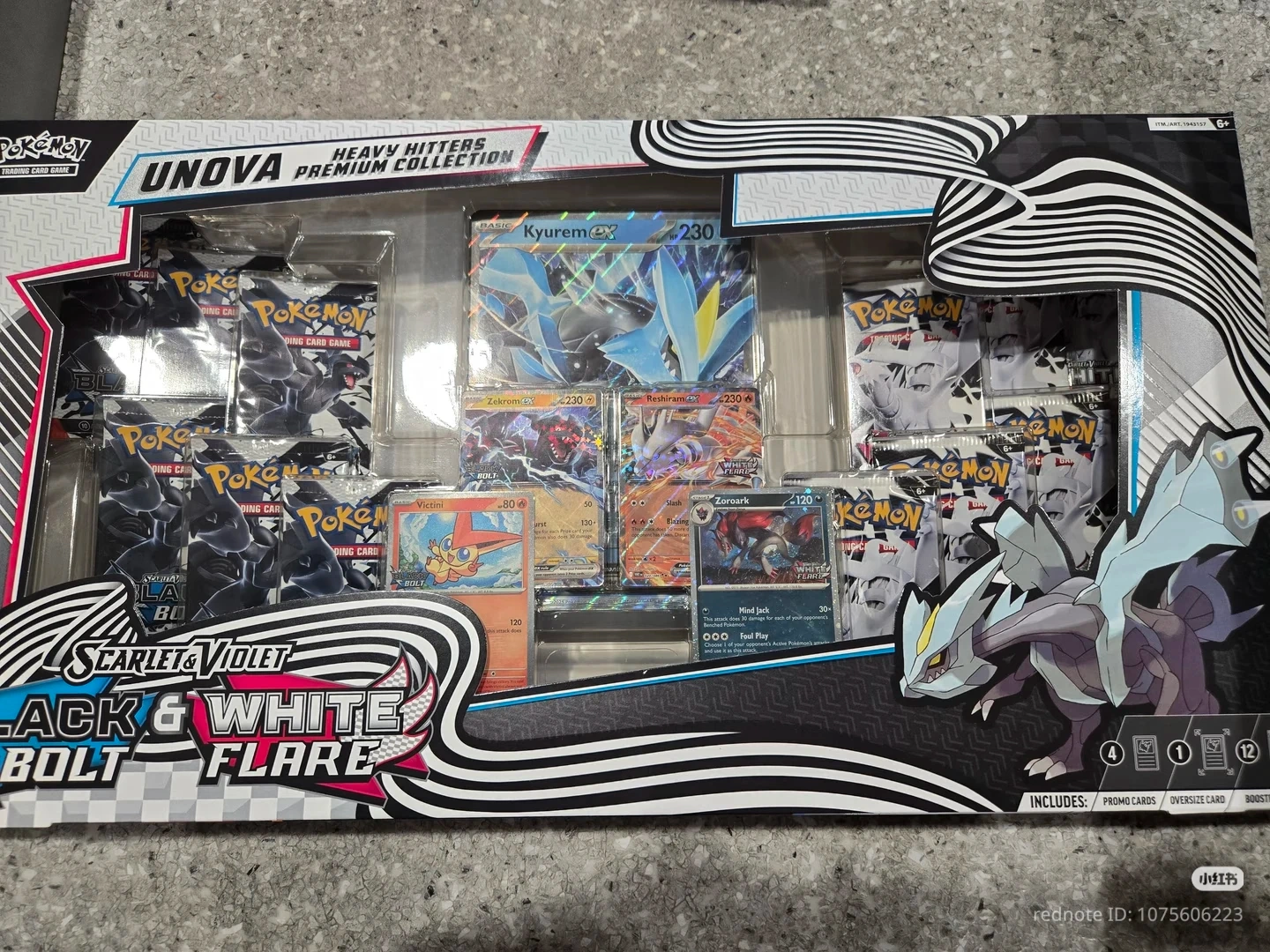 This Pokemon Unova Heavy Hitters Premium Collection features various Pokémon trading cards. It includes promo cards and an oversized card. The collection is from the Scarlet & Violet Black & White Bolt Flare series.