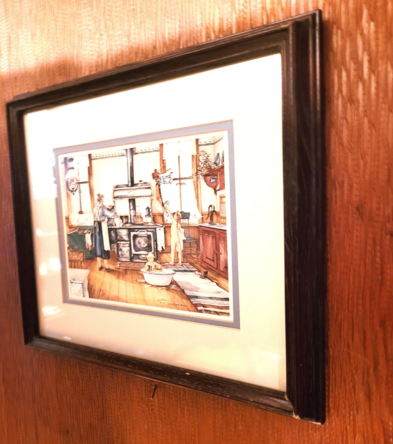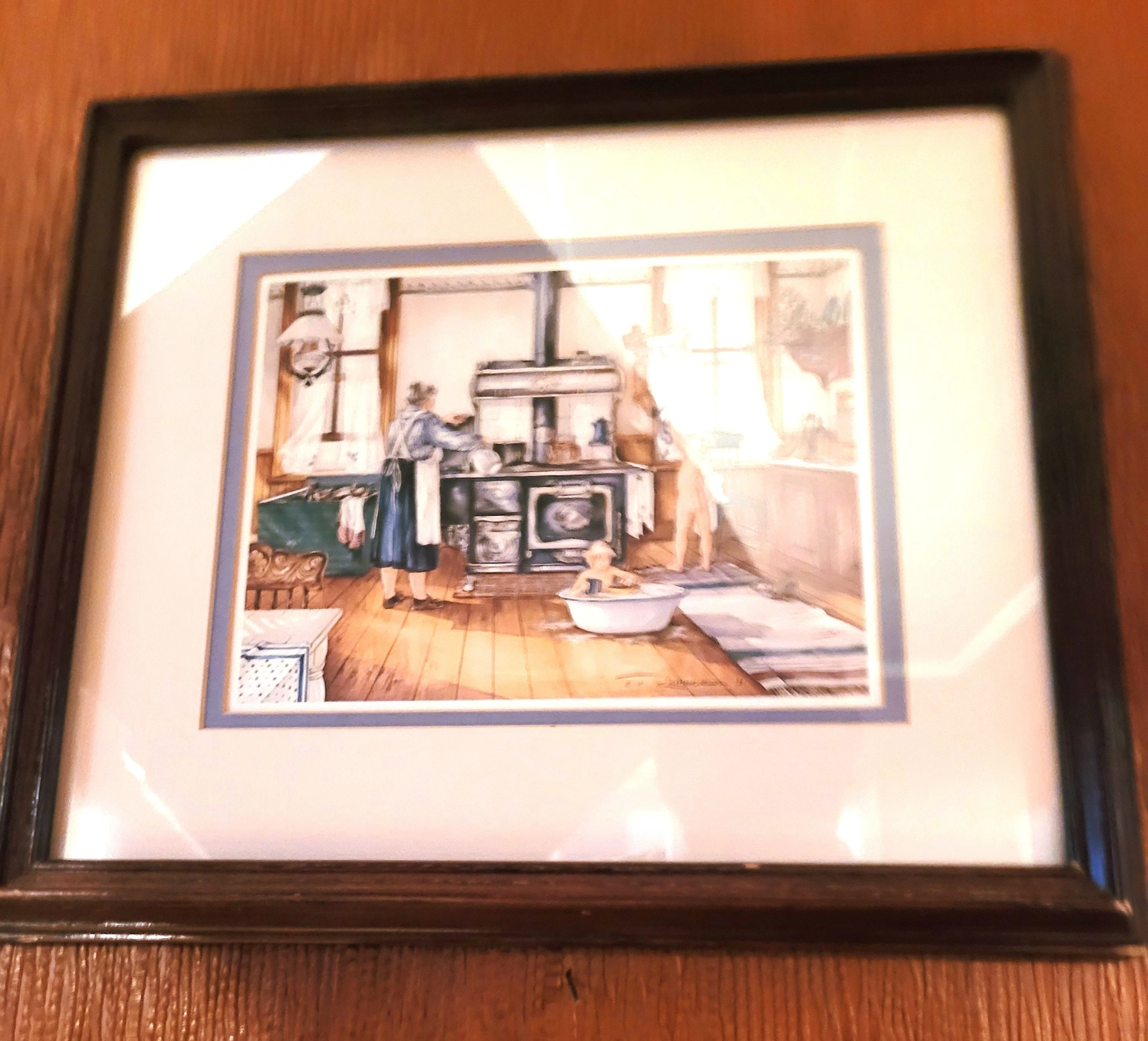 This is a charming vintage framed piece featuring the iconic "Kitchen Bath" scene by Trisha Romance. This particular item is a high-quality vintage magazine clipping from the 1980s, professionally matted and framed to give it the appearance of a gallery print.