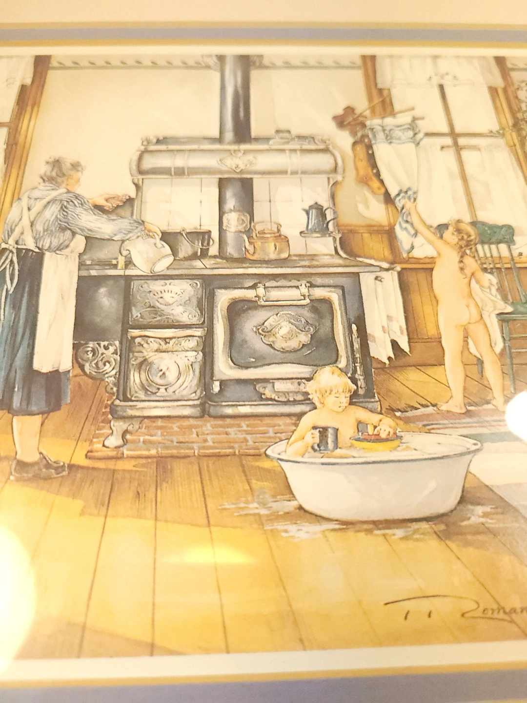 It captures all the warmth and sun-drenched detail of the original 1981 painting, featuring the beloved scene of a grandmother and children by the woodstove.