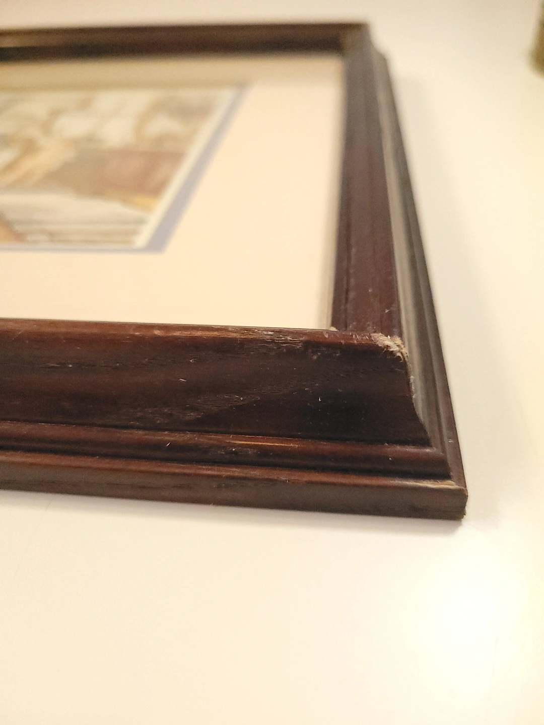 The frame is in vintage "as-found" condition with some visible scuffs and chips on the wood edges, lending it a rustic, lived-in farmhouse feel. The image itself is bright and clear.