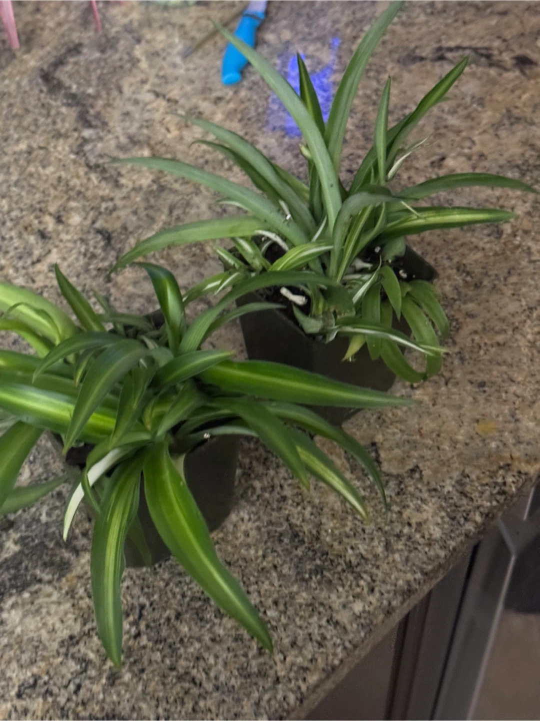 Two healthy spider plants in black pots. These plants have distinctive green and white striped leaves. They're easy to care for and great for adding some greenery to your home.
