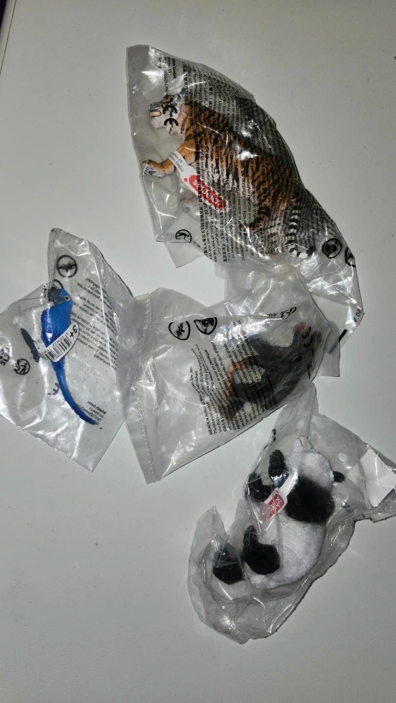 This is a Schleich Wild Life 4 PC Jungle Animals Figurines Toy Set. It includes a tiger, panda, parrot, and monkey. These toys are suitable for kids ages 3 and up.