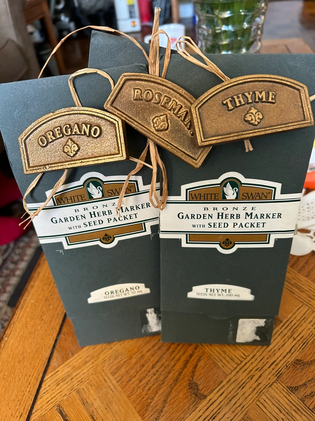 Set of three White Swan bronze garden herb markers, each with a seed packet. Includes Oregano (50 mg seeds), Thyme (100 mg seeds), and Rosemary (200 mg seeds). These markers are great for identifying your herbs in the garden!