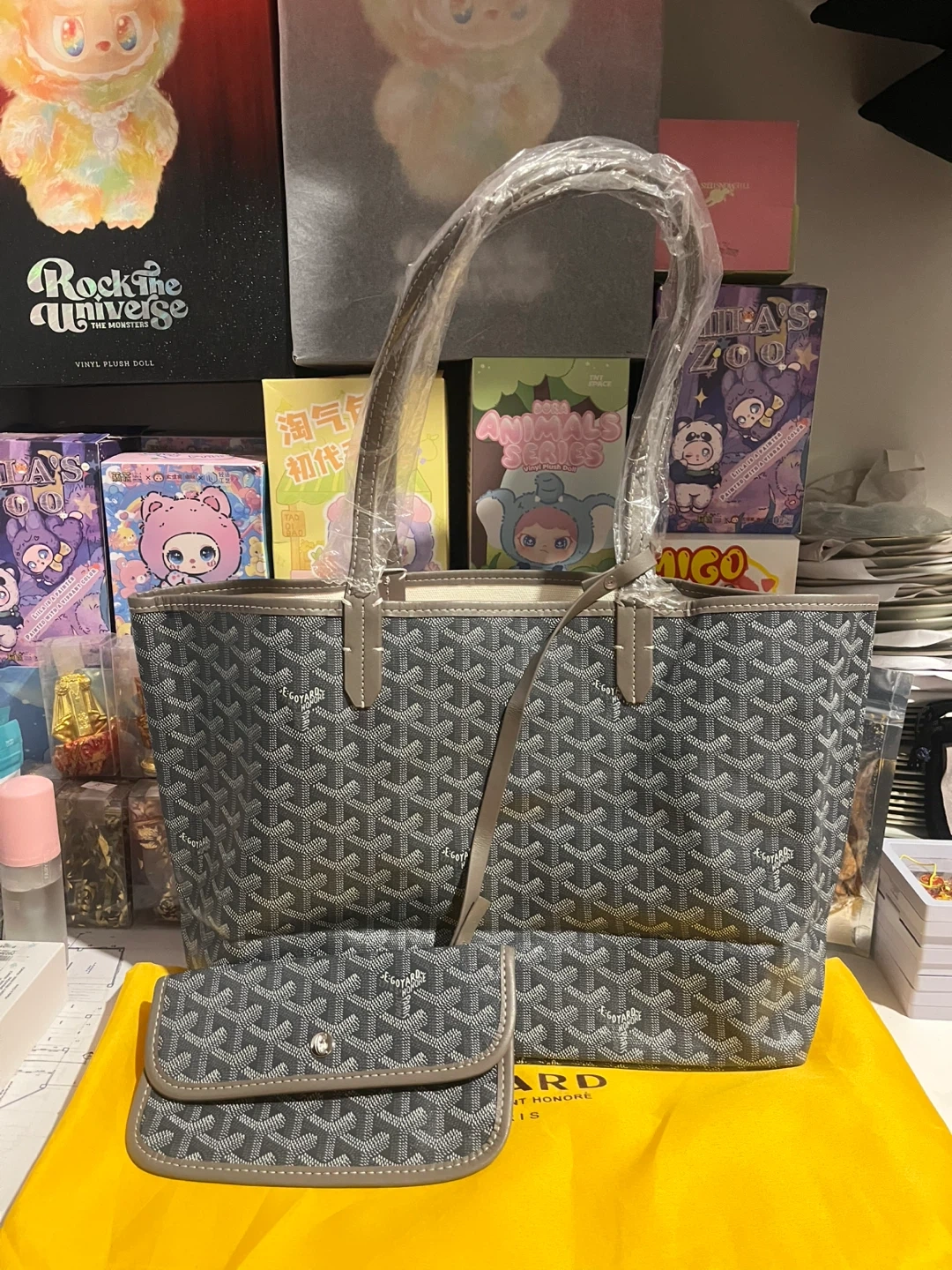 This is a Goyard tote bag with a matching pouch. The bag features the signature Goyardine canvas and leather trim. It's a classic style for everyday use! Replica