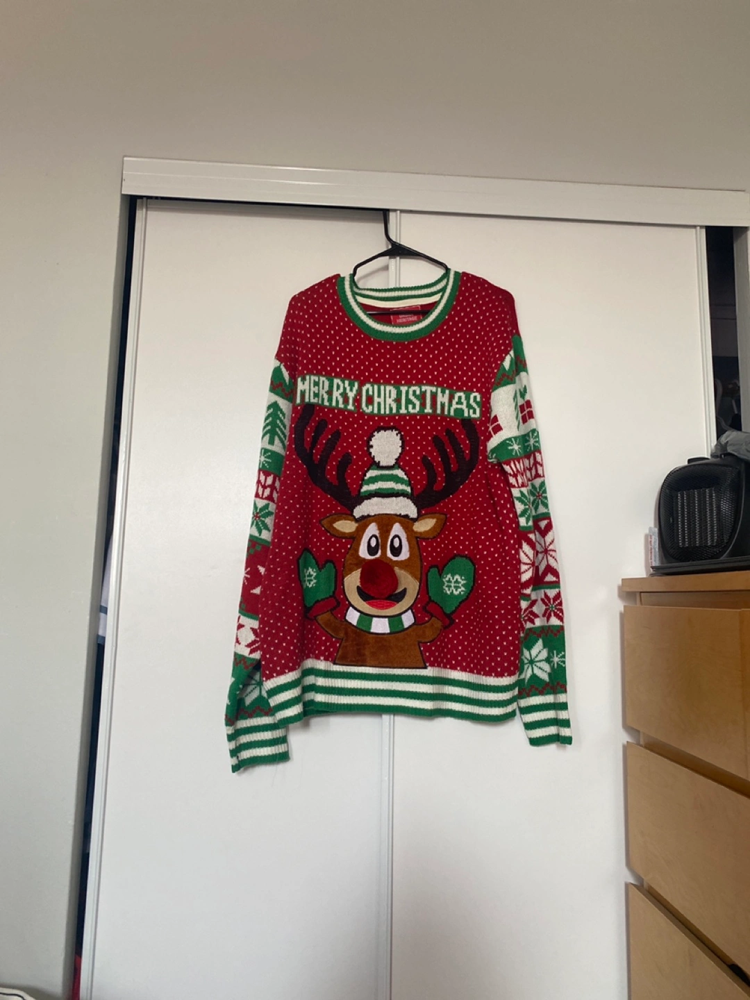 A festive Merry Christmas sweater with a reindeer design! Perfect for the holidays, this sweater is sure to bring some cheer to your wardrobe