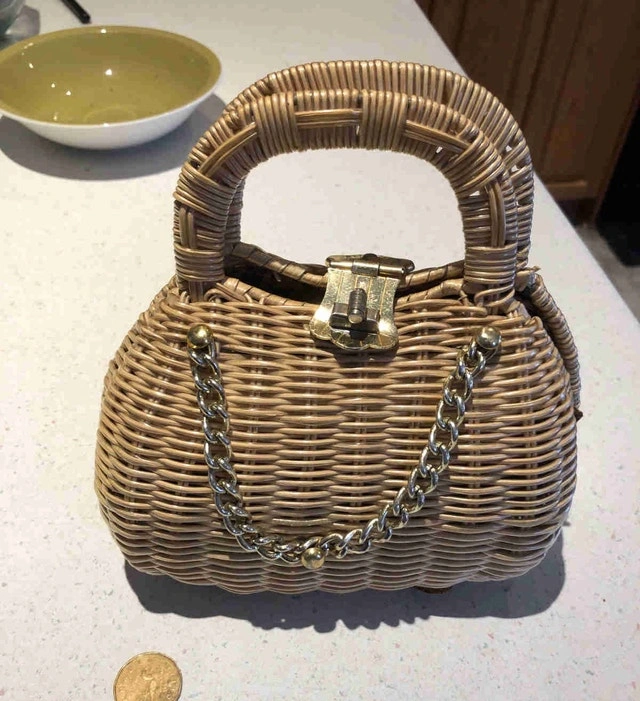 This is a charming vintage wicker Children’s purse made in Hong Kong, featuring a unique design with a chain accent. The purse is in used condition, with some signs of wear that add to its vintage appeal. The interior is lined with a patterned fabric. This stylish bag is perfect for adding a touch of retro flair to any outfit. If you are reading this, this wicker purse is still available! Asking price is $7.