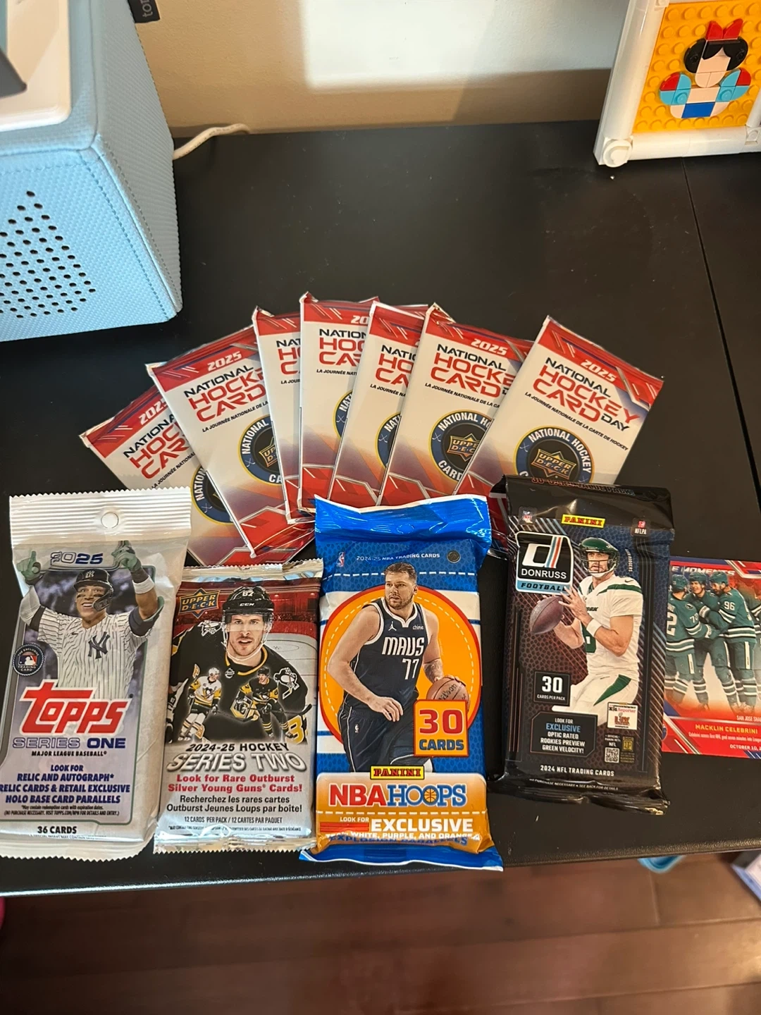 Get a mix of sports with these trading card packs! Includes 2025 National Hockey Card Day packs, 2024-25 Upper Deck Series Two Hockey, 2025 Topps Series One Baseball, 2024-25 NBA Hoops, and 2024 Donruss Football. Great for collectors looking for potential hits!
