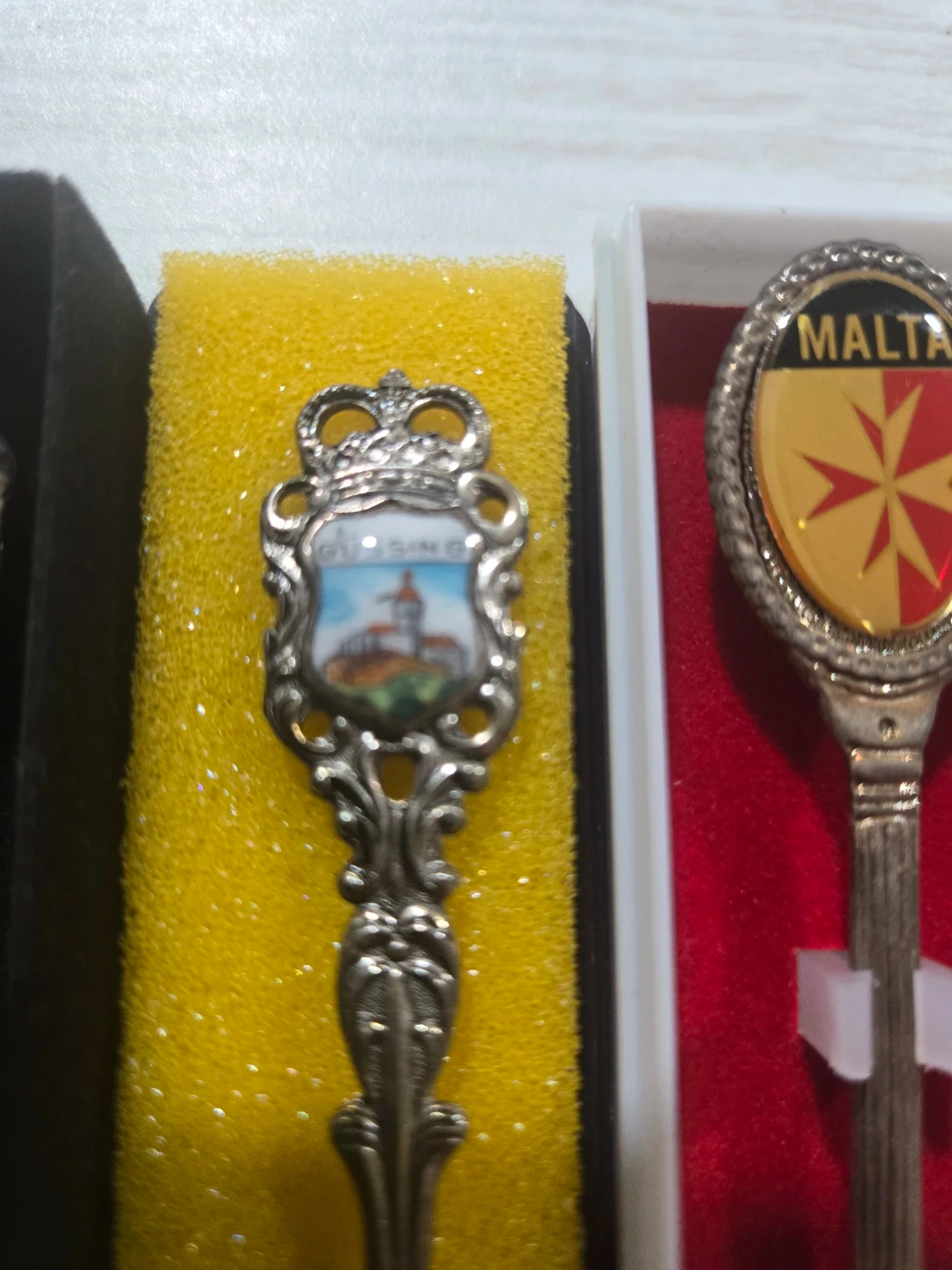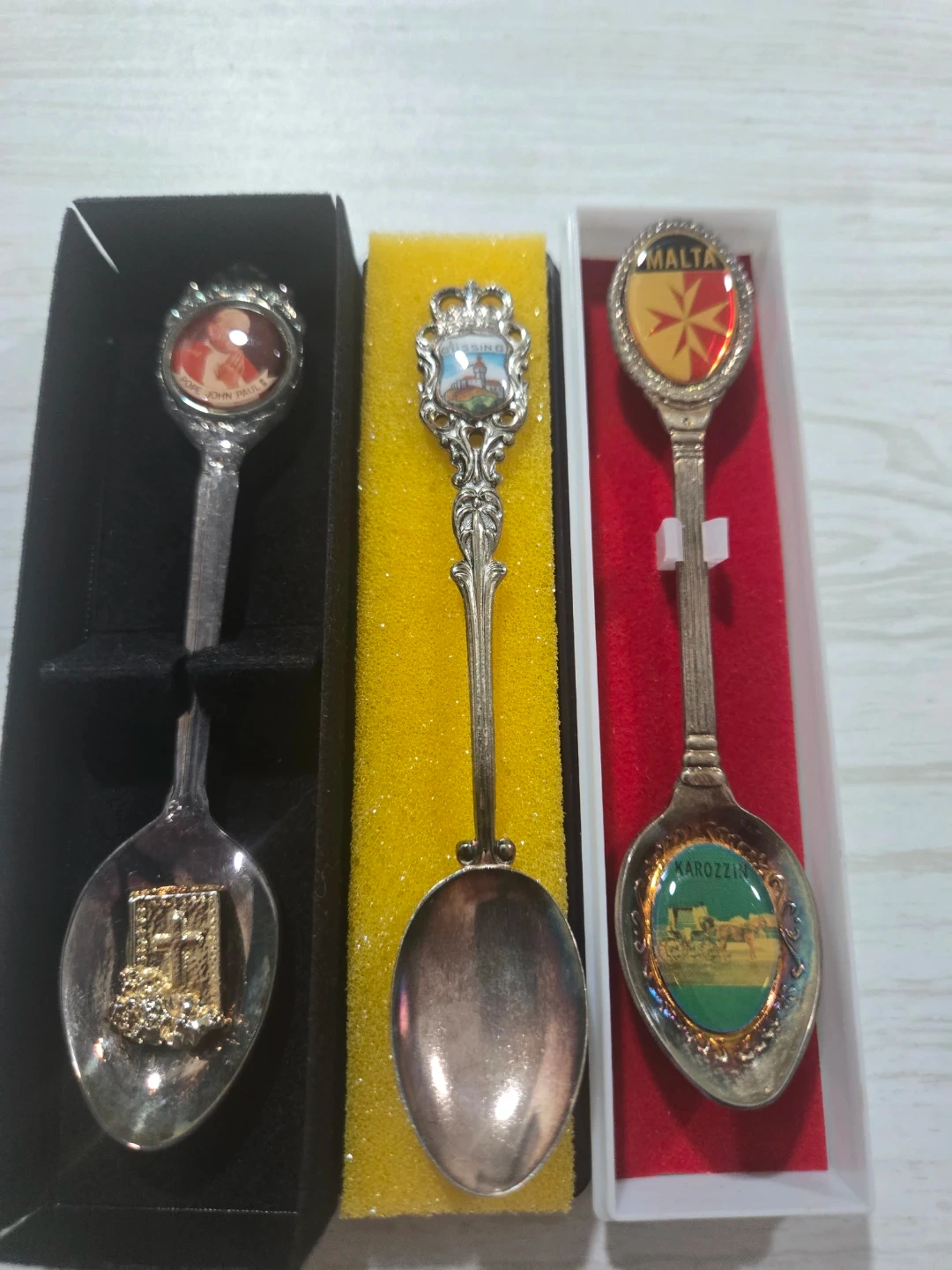 This set includes three decorative souvenir spoons. One spoon features Pope John Paul II, and another depicts a scene with the text 'MALTA'. The third spoon is from Gussing Austria .. They're presented in individual boxes, with two featuring yellow and red foam lining. All three $3 firm.