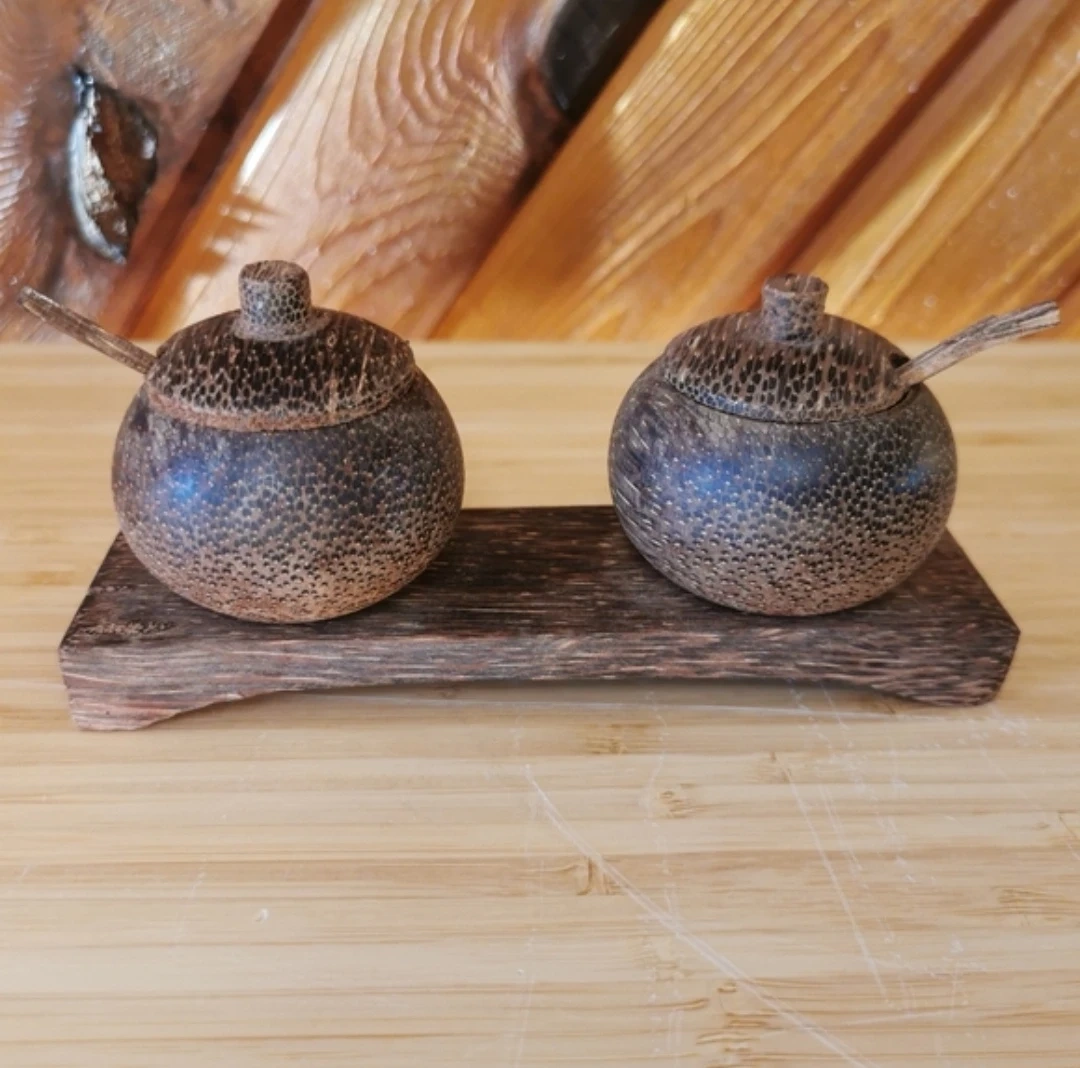Beautiful pair of wooden artisan salt and pepper bowls with lids and spoons attached on a wooden serving tray.