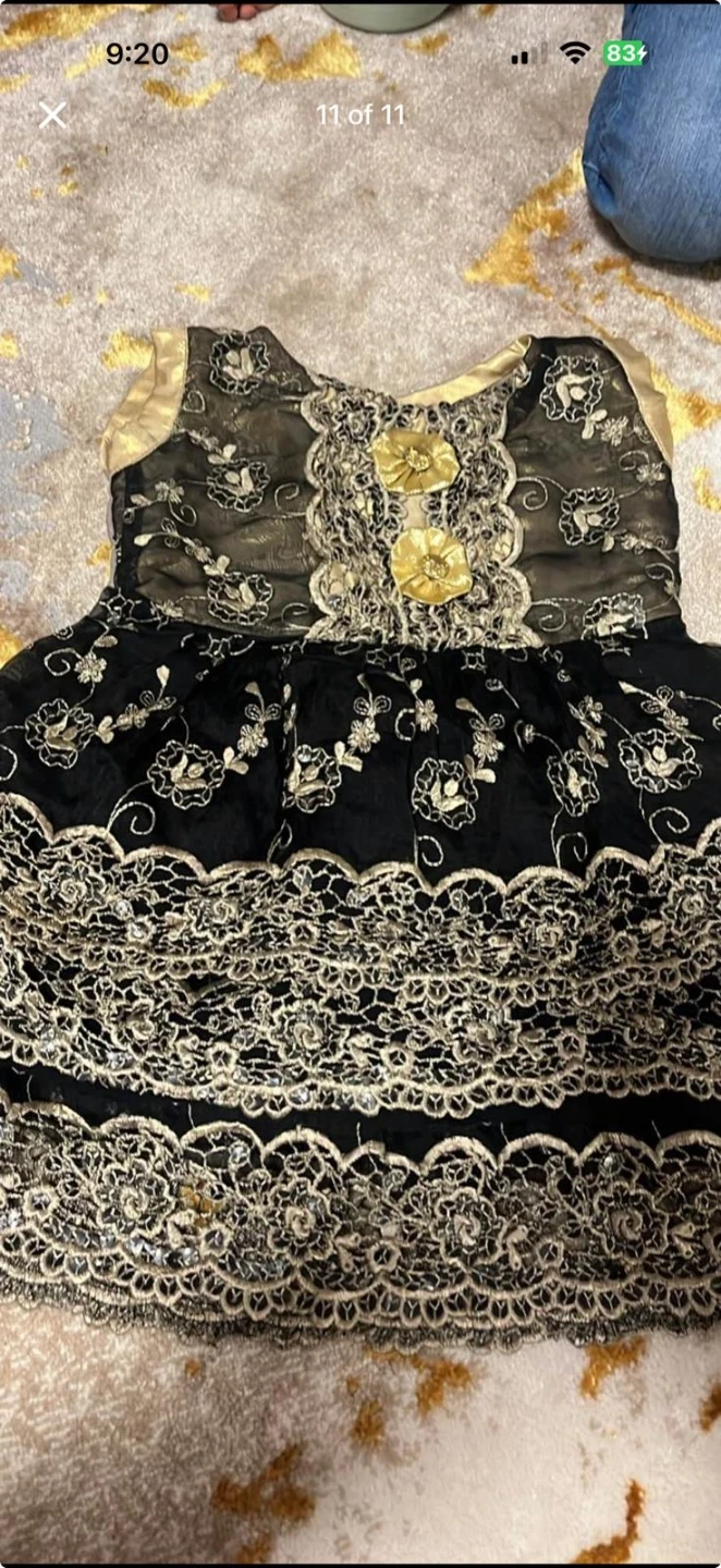 Selling a dress with black and gold detailing. It has a lace trim and flower accents. Kids grow fast hardly worn for kids age 2 to 4 years can be worn for special occasions like birthday or wedding