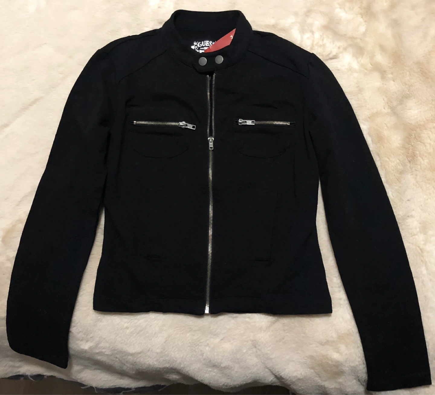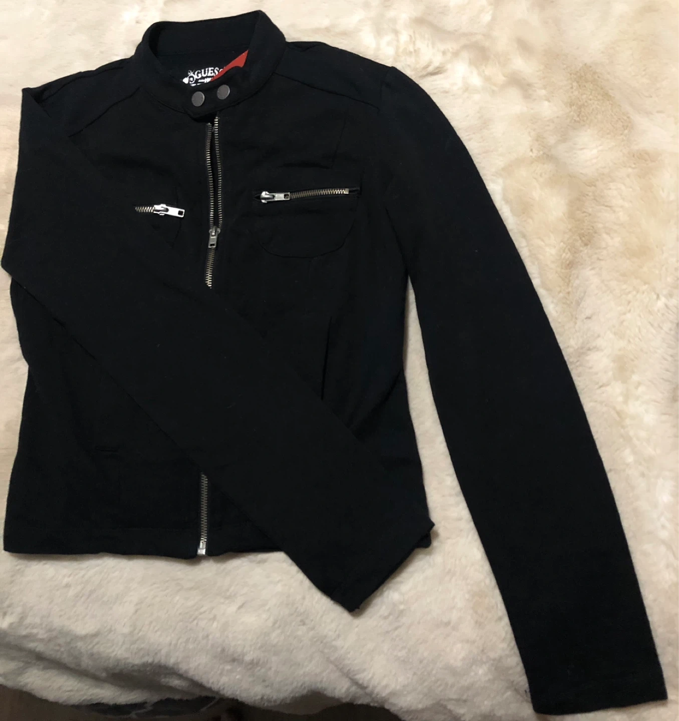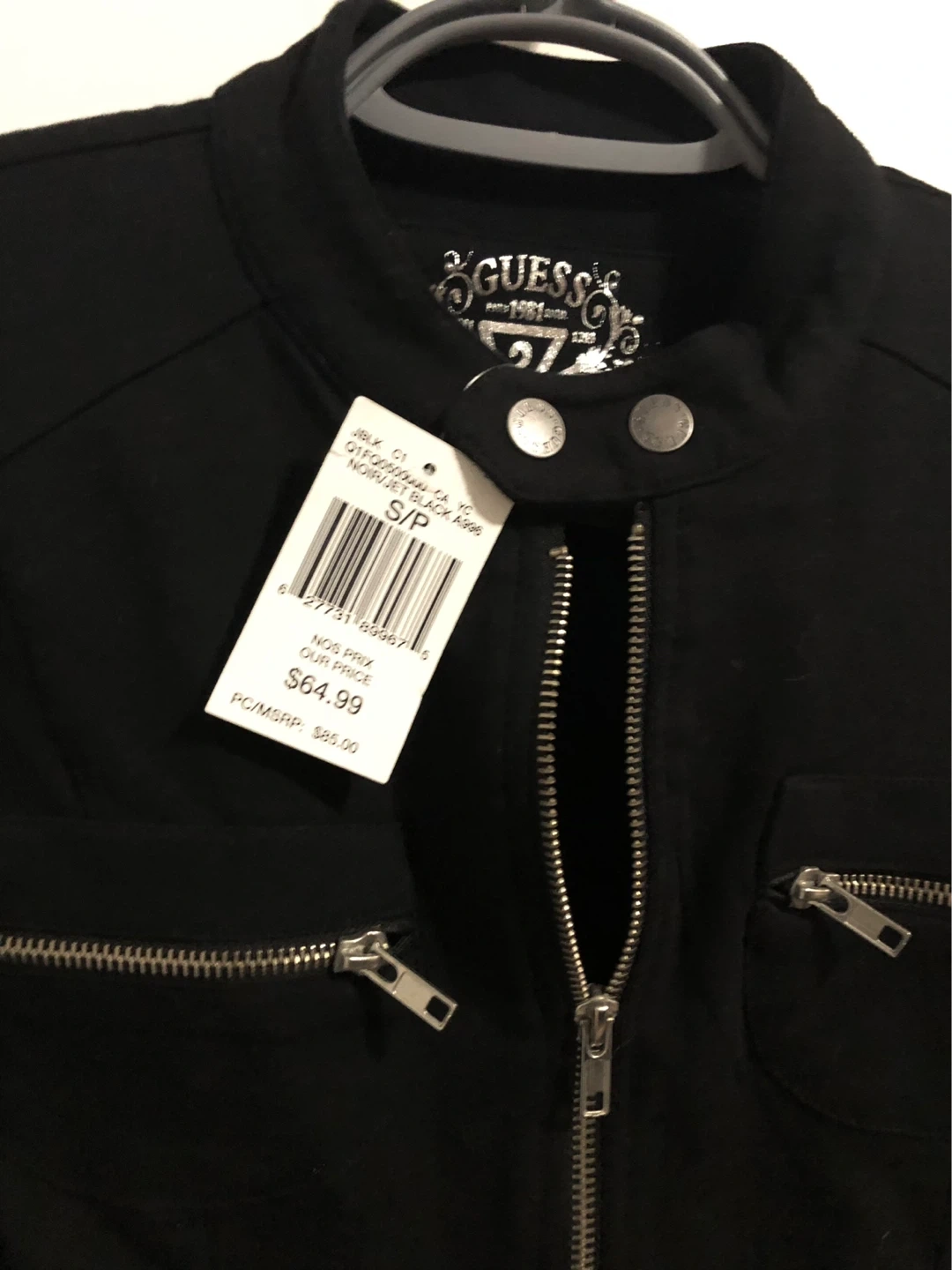 New with tags Black Guess sweater jacket with a zip-up front and zippered top pockets and 2 regular side pockets. Material is stretchy. Size is small.