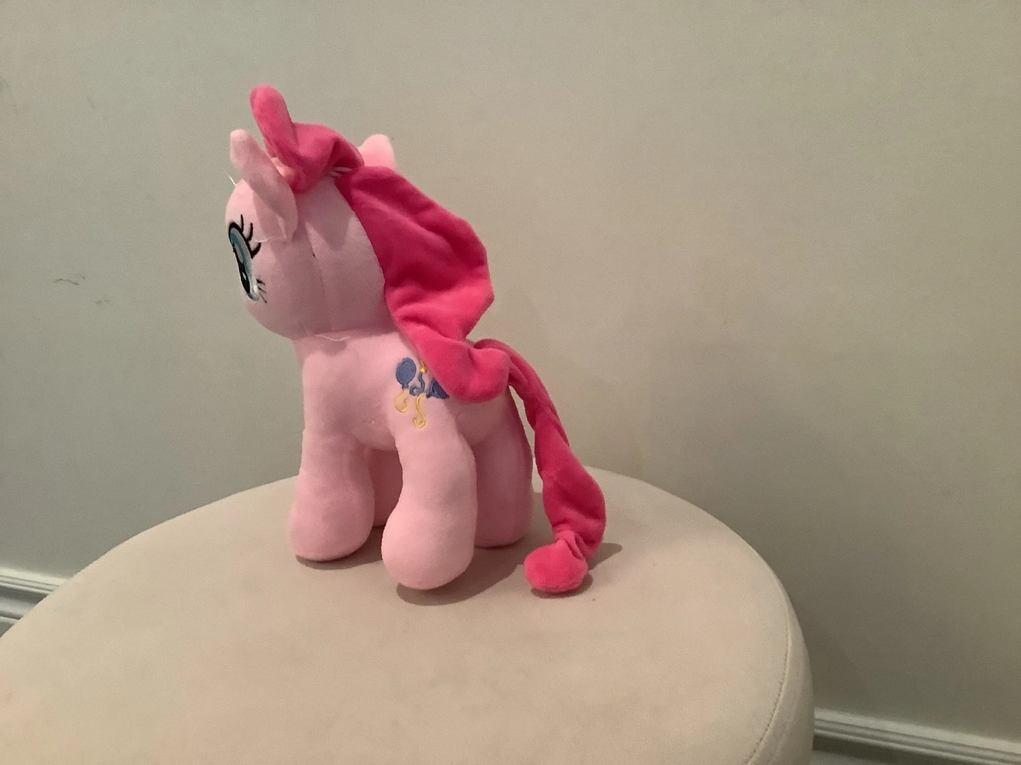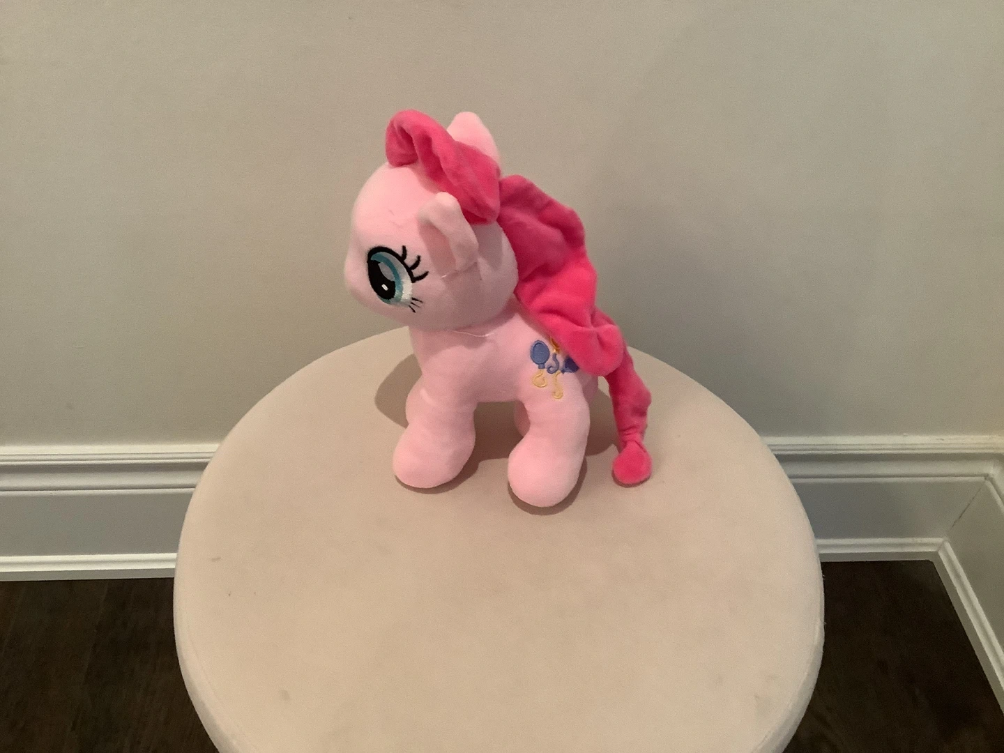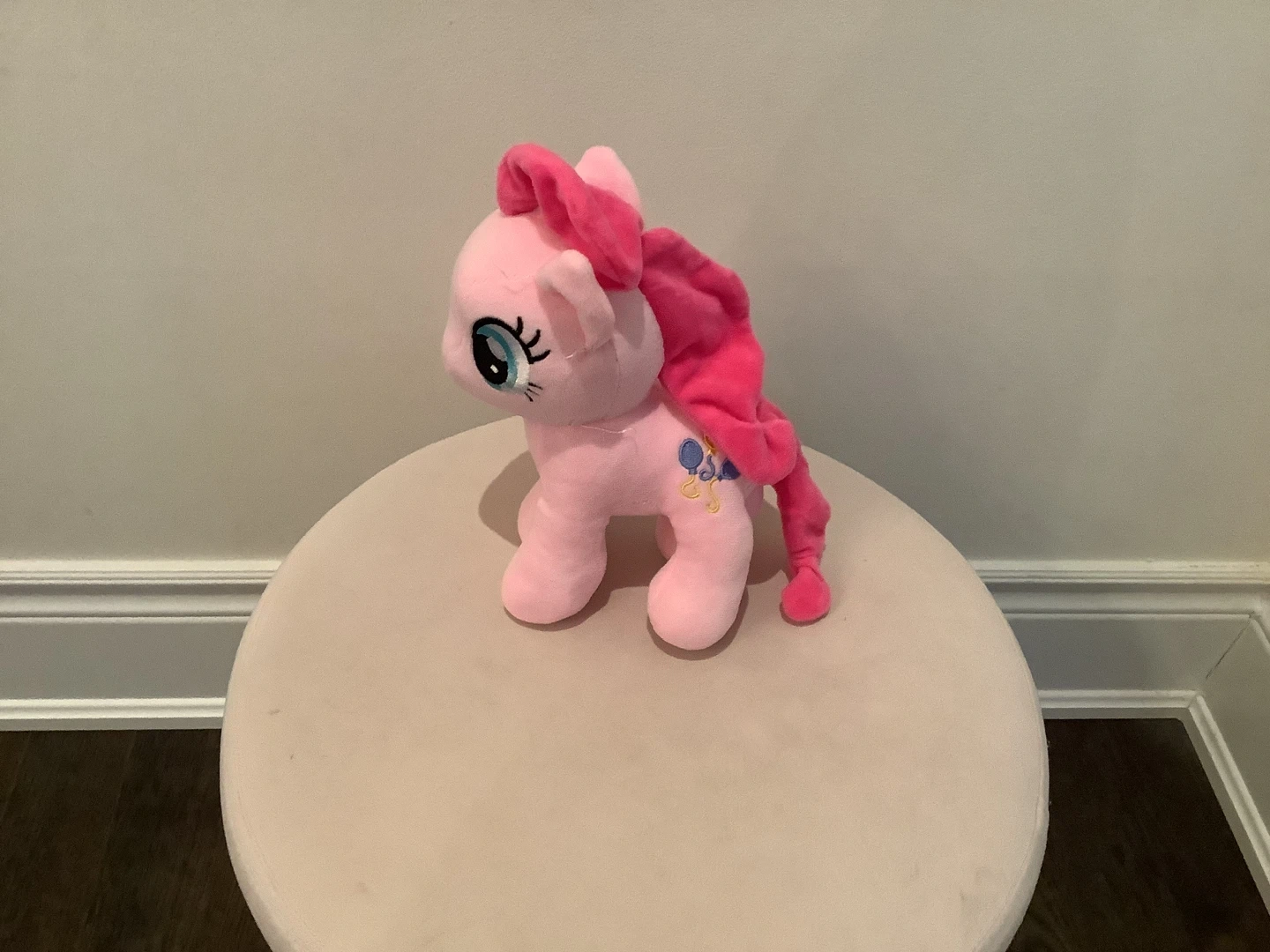 A soft pink plush toy of Pinkie Pie from My Little Pony. It features her signature blue balloons cutie mark and bright pink mane and tail. This stuffed animal is perfect for any My Little Pony fan!