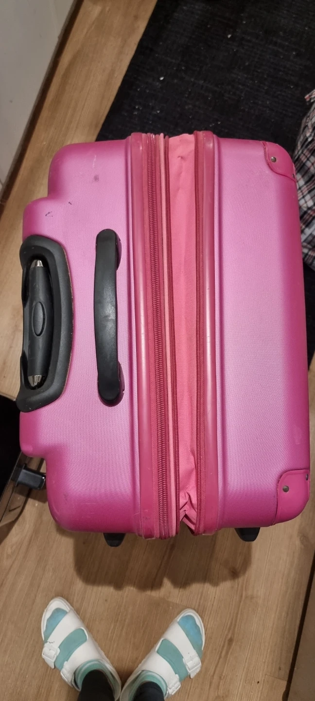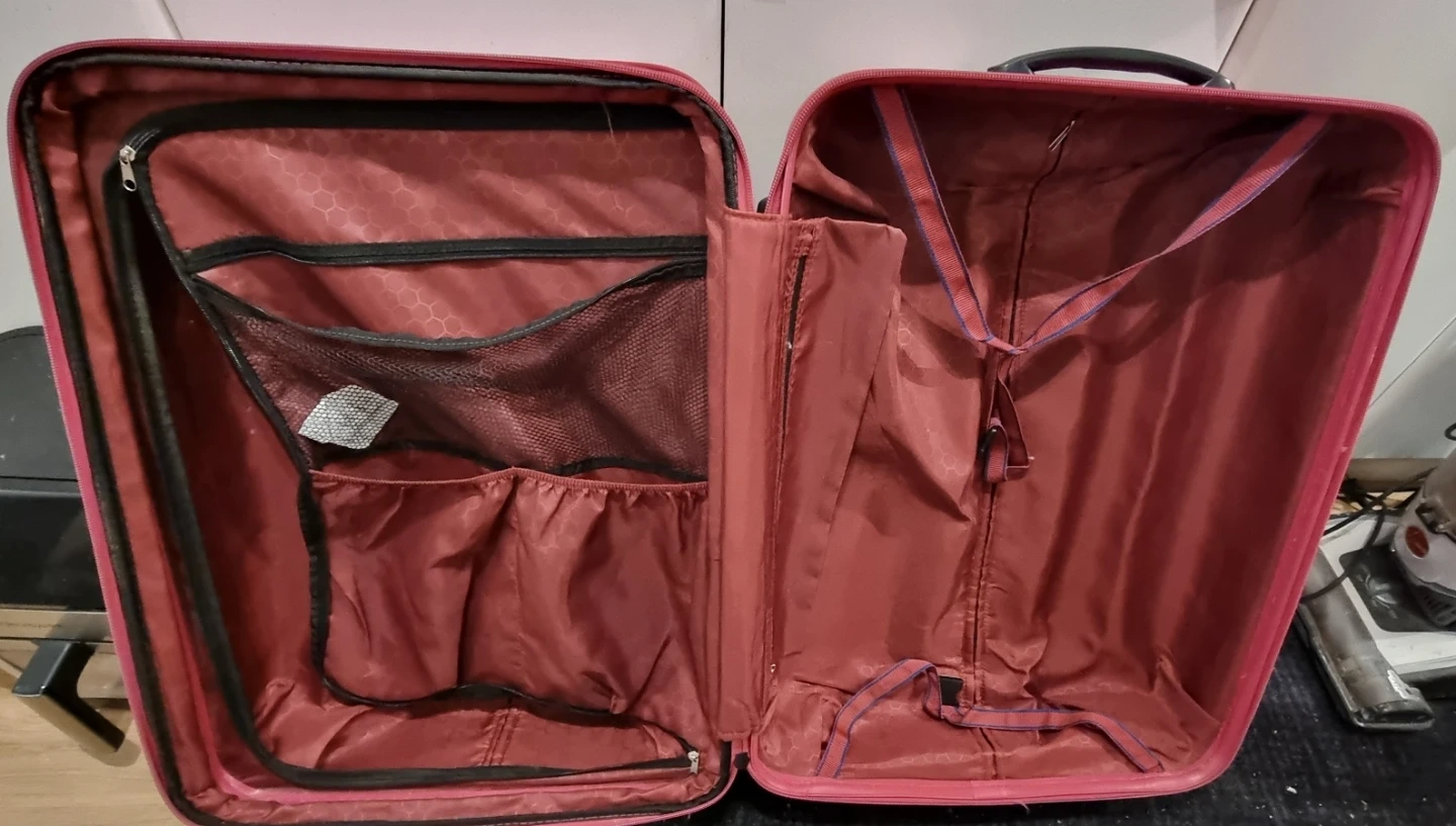 This is a pink Luxardo rolling suitcase. It's a large size with a hard shell exterior. The interior has elastic straps and mesh pockets for organization.