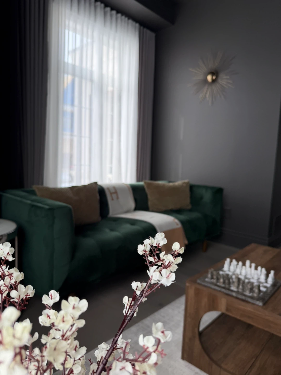 Emerald green 3 seater sofa with throw pillows