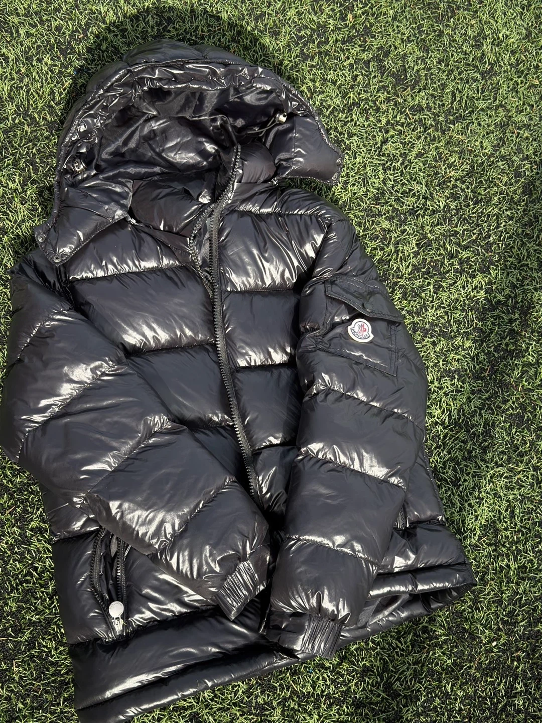Shiny black Moncler puffer jacket with hood. It's a puffy, insulated winter coat. Features the Moncler logo on the sleeve.
