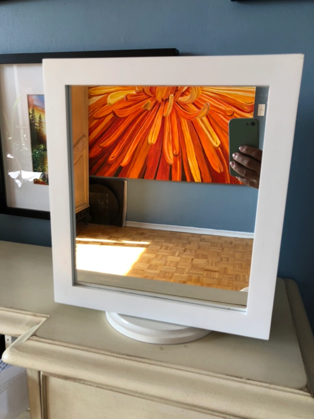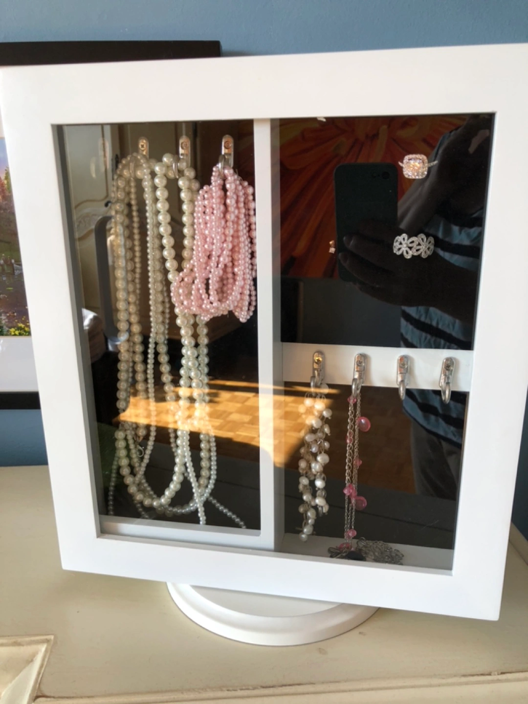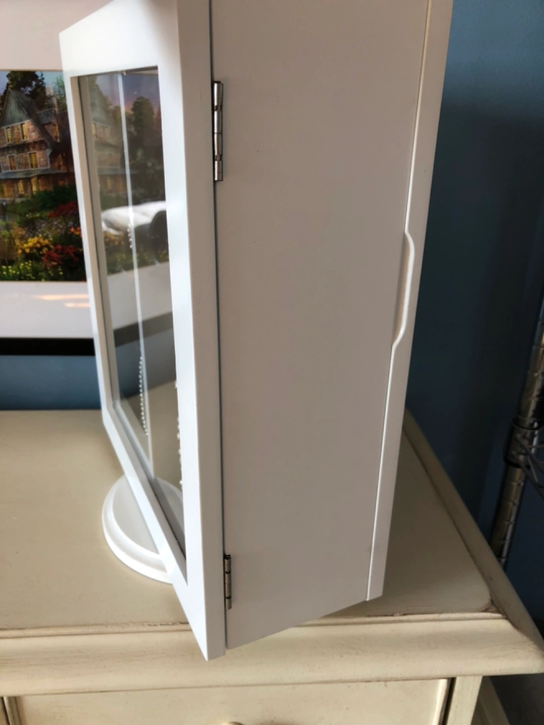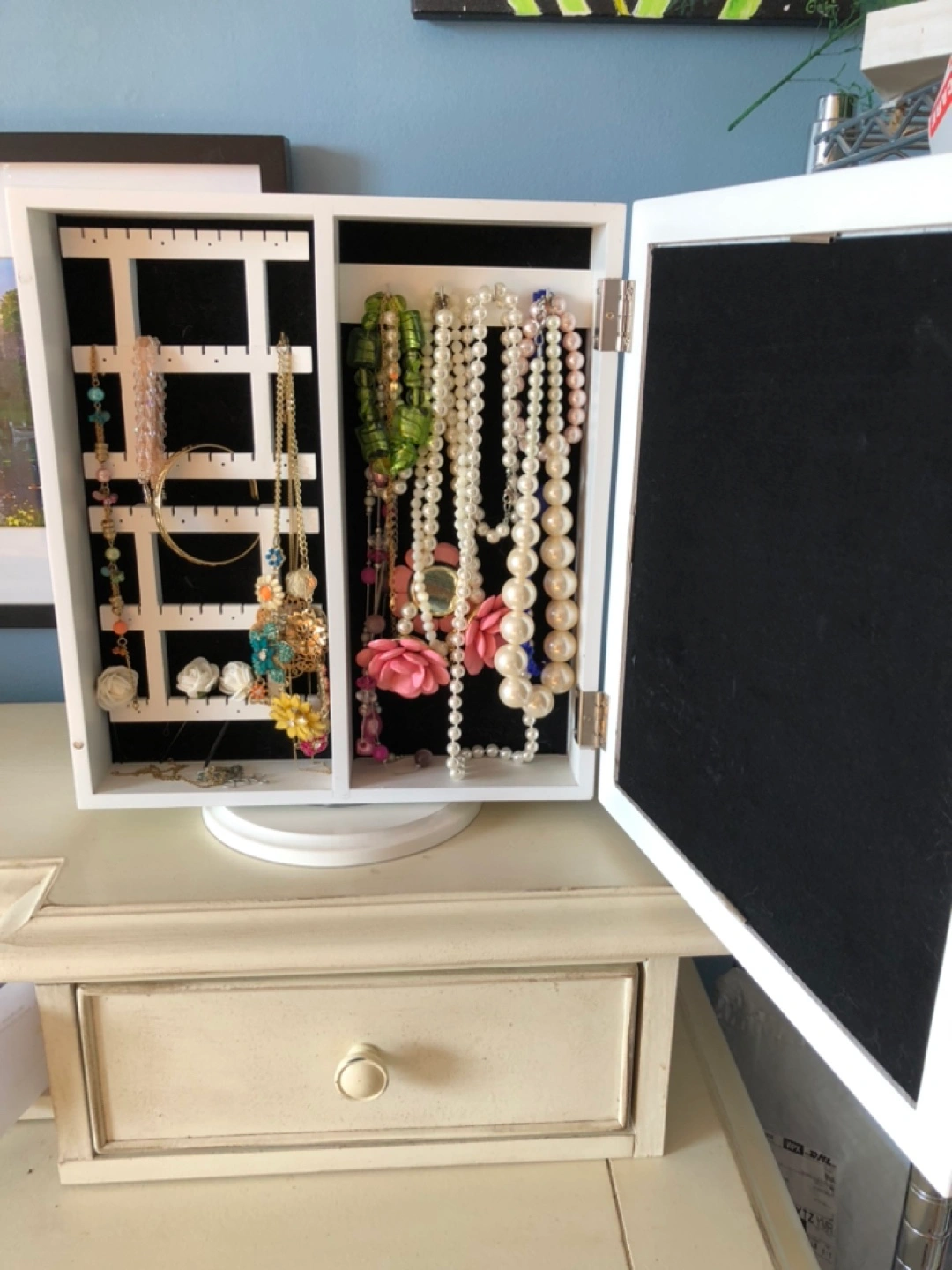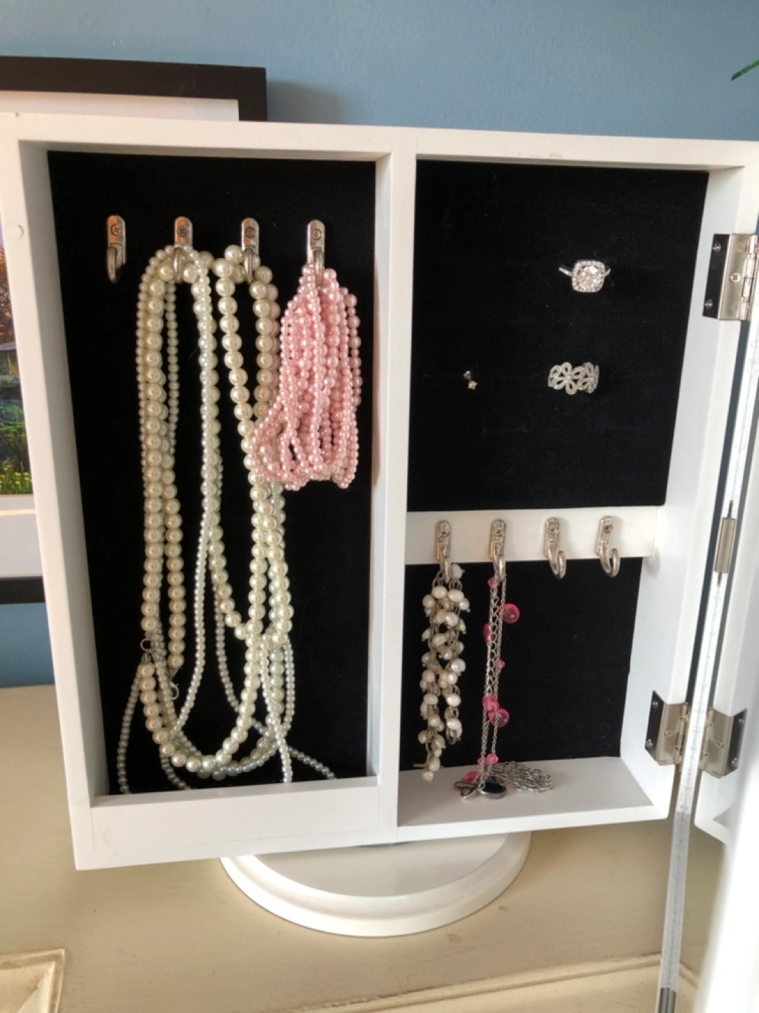 A rotating jewelry armoire and mirror. Constructed of white wood. The armoire has two sides with multiple hooks and shelves. The mirror is rectangular. The armoire sits on a white circular base and hinges open. This would be perfect for making selecting your daily jewelry feel like a peaceful activity.