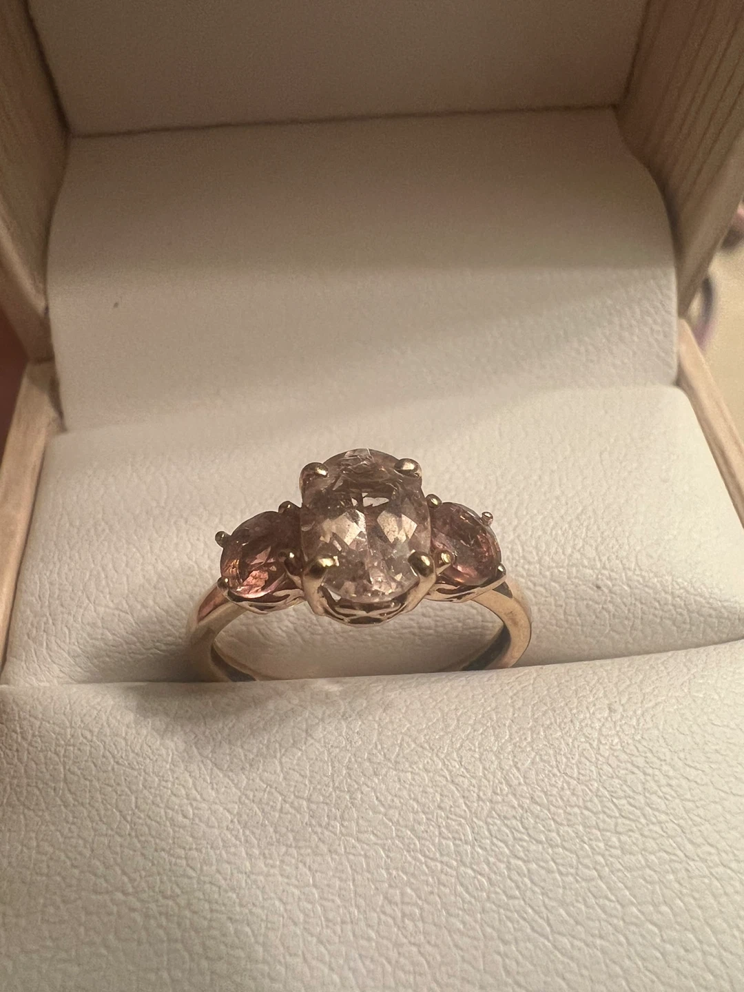 Beautiful 10 k morganite and pink tourmaline ring in a box. It's a stunning piece that would make a lovely addition to any jewelry collection