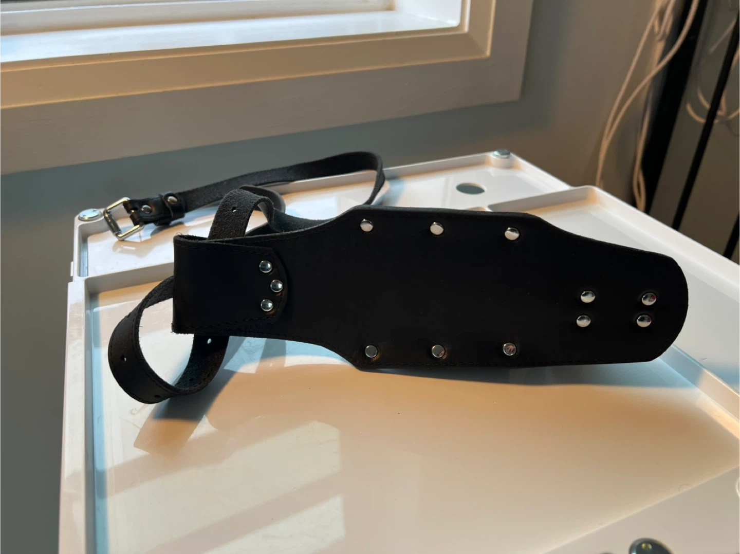 Handmade black leather hip holster. Comes with a small adjustable belt.