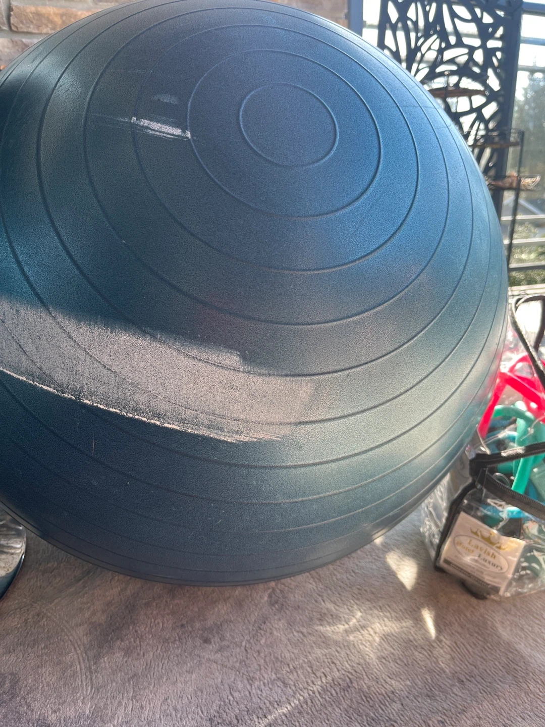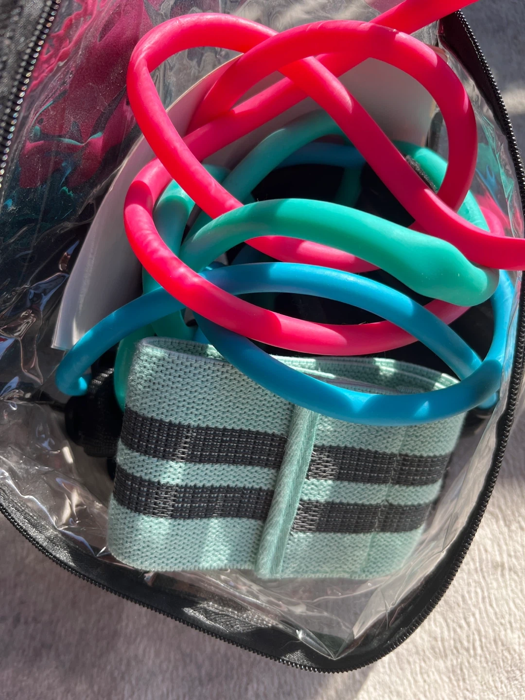 Includes two large exercise balls one blue seen in the photo with a white strip and one pink one same size not shown on here and a set of colourful resistance bands. 3 elastic bands and one strap. Perfect for your home gym workouts!