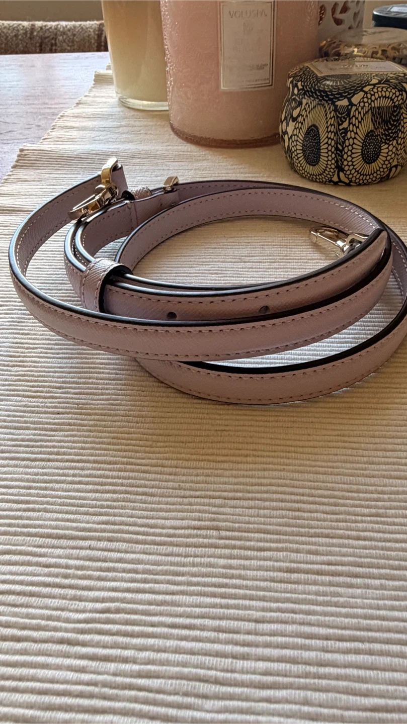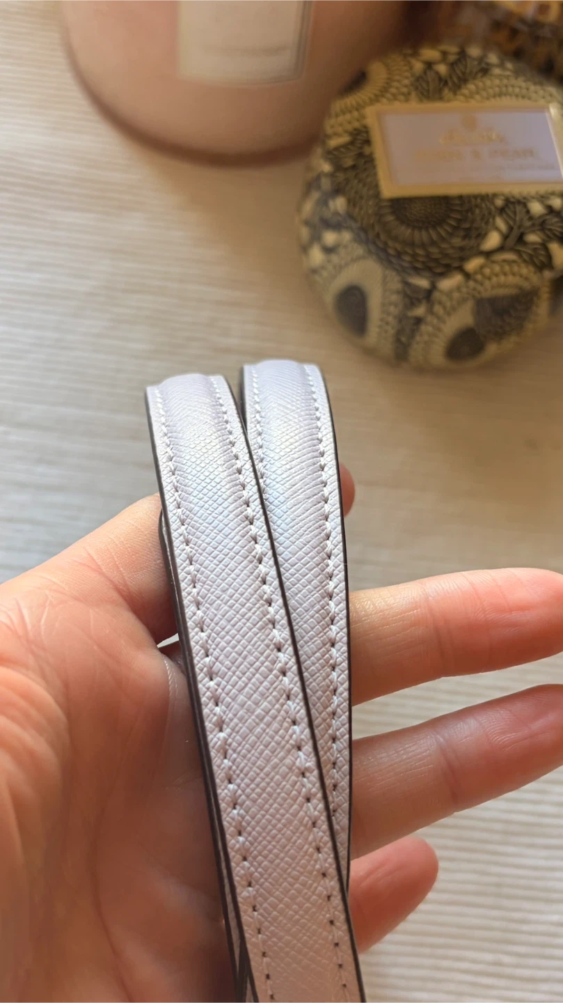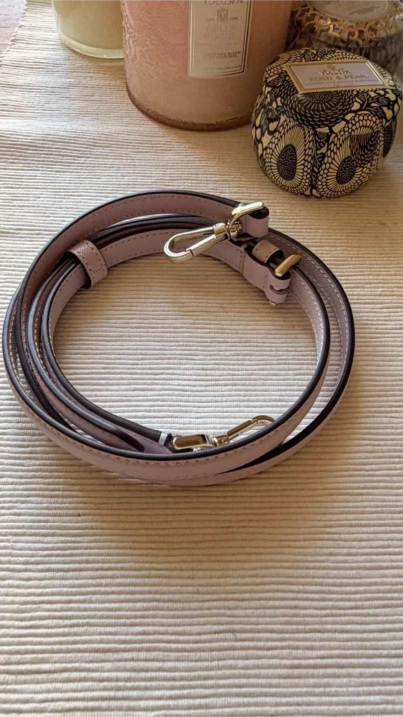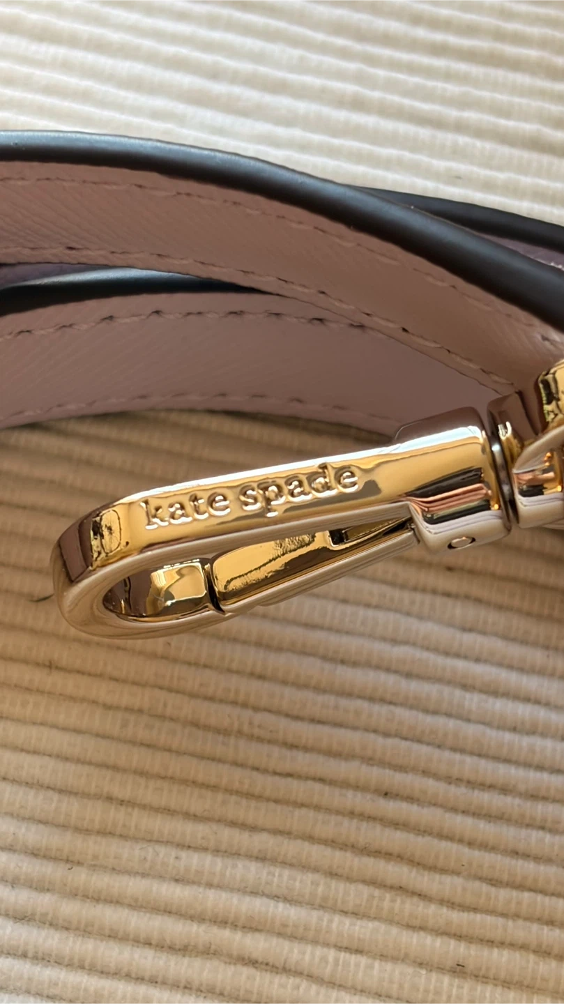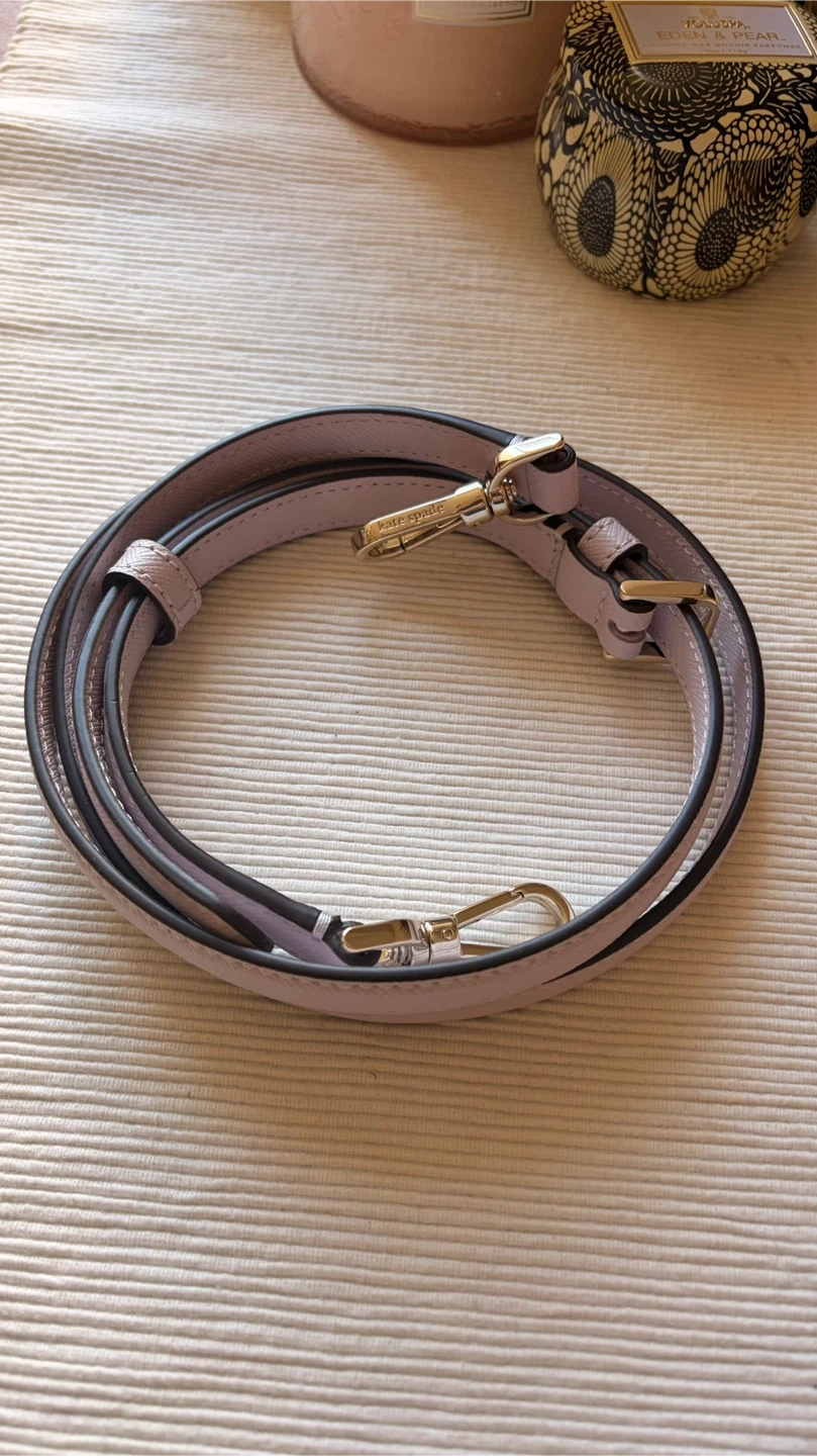 This is a Kate Spade crossbody strap. It's made of Saffiano leather and has silver-tone hardware. It's a versatile accessory for your favourite bag. It would be great for adding a pop of colour to your outfit!