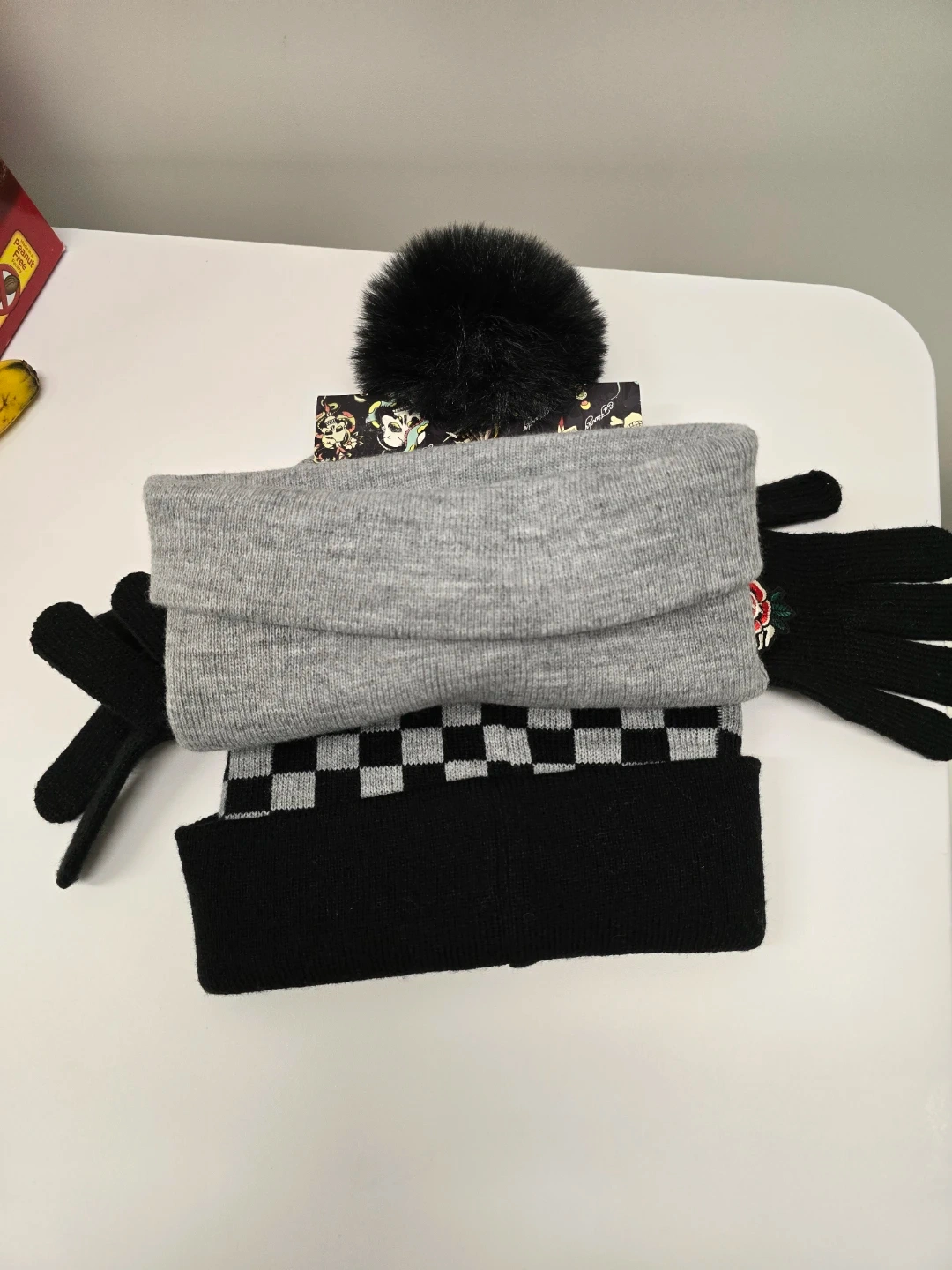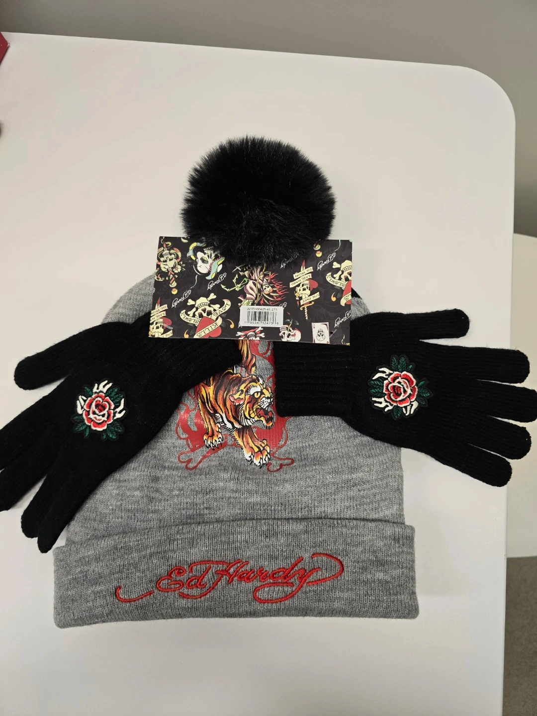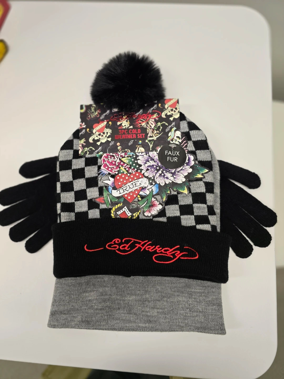Ed Hardy 3PC Cold Weather Set - 2 Hats & Gloves