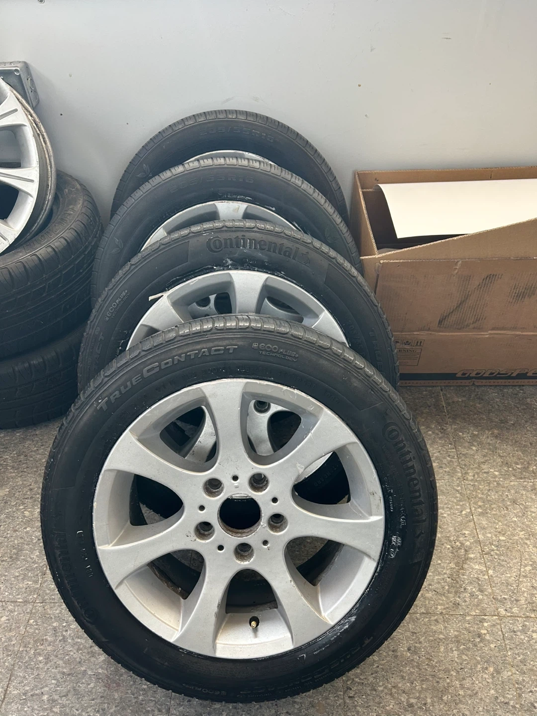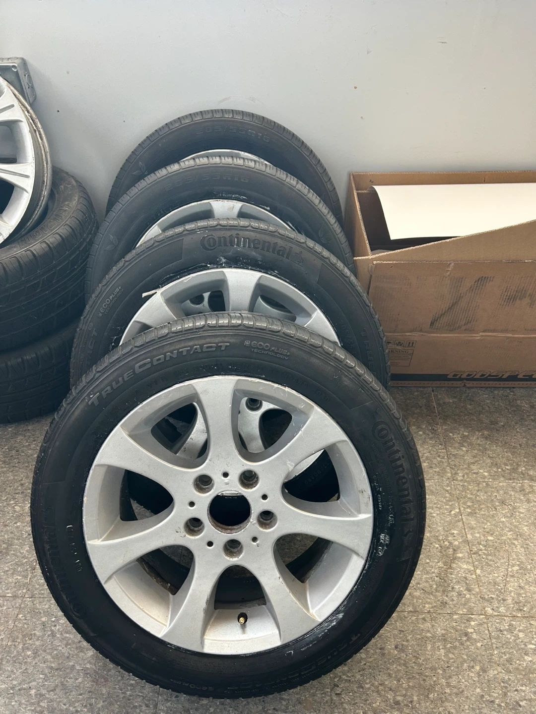 Pair of Continental TrueContact tires & Kaspen all seasons, size 205/55R16, mounted on BMW 162 16 inch alloy rims. These tires are suitable for various seasons and offer a quiet ride. They're in good condition and ready for installation.