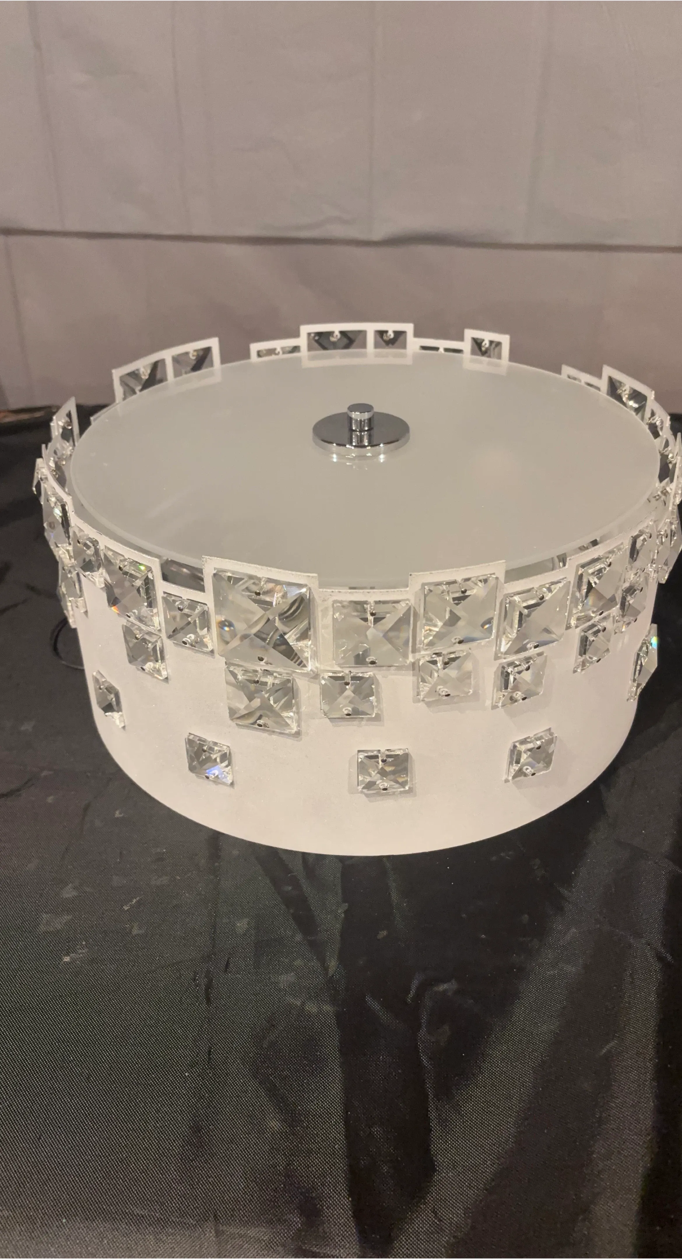 A stylish drum-shaped light fixture with a frosted glass top. It's adorned with sparkling square-cut acrylic crystals around the white cylinder. This light fixture adds a touch of elegance to any room!
