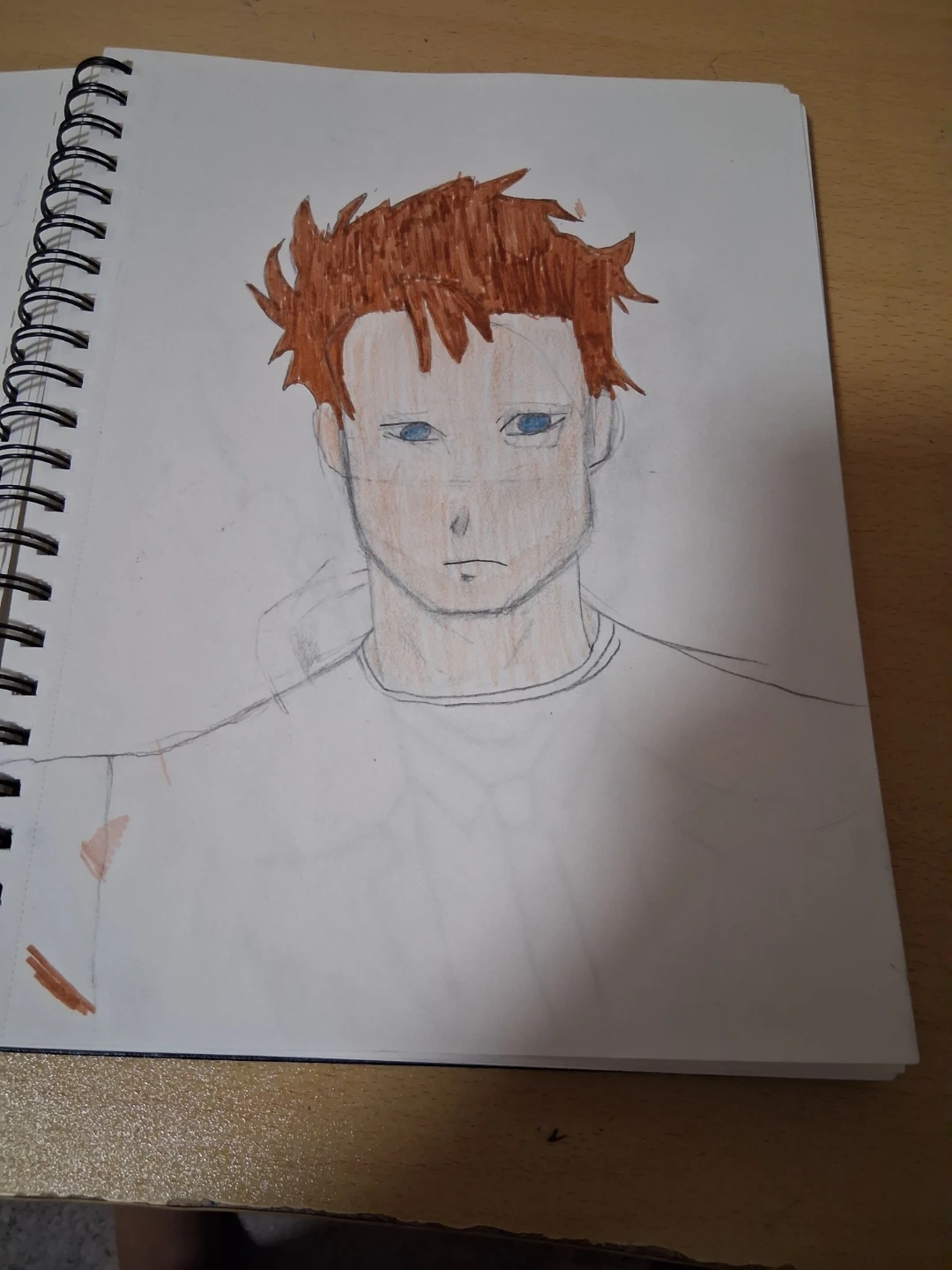 Original drawing of a person's head and shoulders, rendered in an anime-inspired style. The artwork features brown spiky hair, blue eyes, and a neutral expression. It's sketched on paper in a sketchbook.